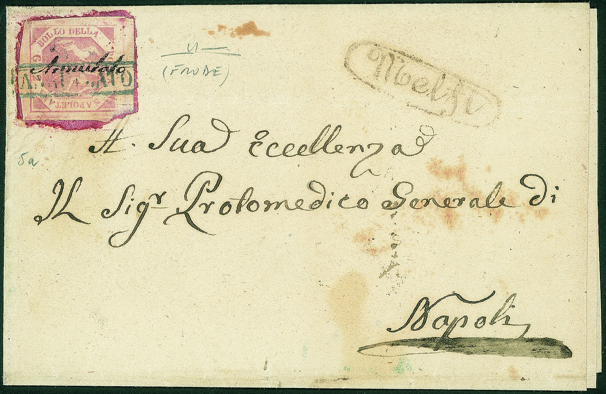 Antichi Stati Italiani - Napoli - Lettera spedita da Melfi per NapoliE affrancata con 2 gr. I tav. rosa lillaceo riutilizzato il 28 aprile 1858 e annullato con scritta a penna (p. 13). Bella e rara FRODE postale non scoperta (Sass. 5a). Cert. Manzoni