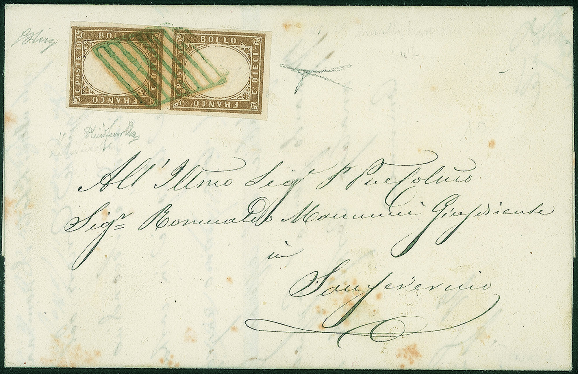 Antichi Stati Italiani - Stato pontificio - Lettera da Fabriano con coppia verticale del 10 cent. bruno tenue (Sass. 14Ch)Annullata con griglia azzurra e Fabriano SI al verso sempre in azzurro (Sass. R1) Cert. Bottacchi