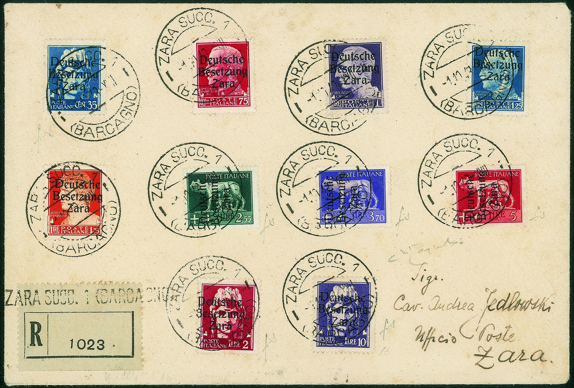 Occupazione Tedesca - Zara - Dieci valori della serie Imperiale (7/16) su raccomandata del 1.10.43 per città - cert oro Raybaudi