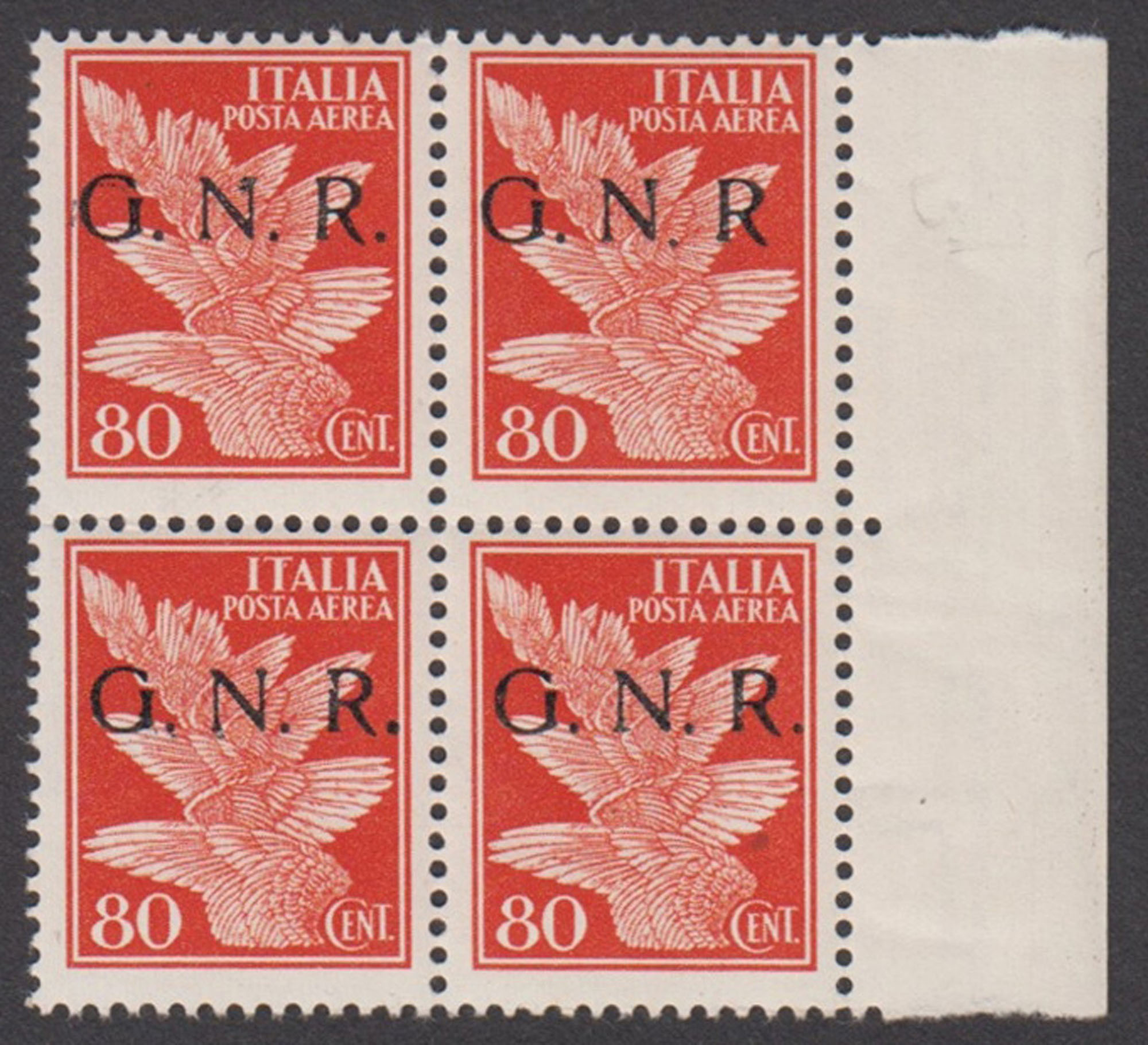 RSI - G.N.R. Brescia - 80 cent (120/I)1943 - GNR Brescia - Quartina (pos. 9/20) del 80 cent con R senza punto (errore i) + R punto grosso (errore iab) - gomma originale integra - (120/I)