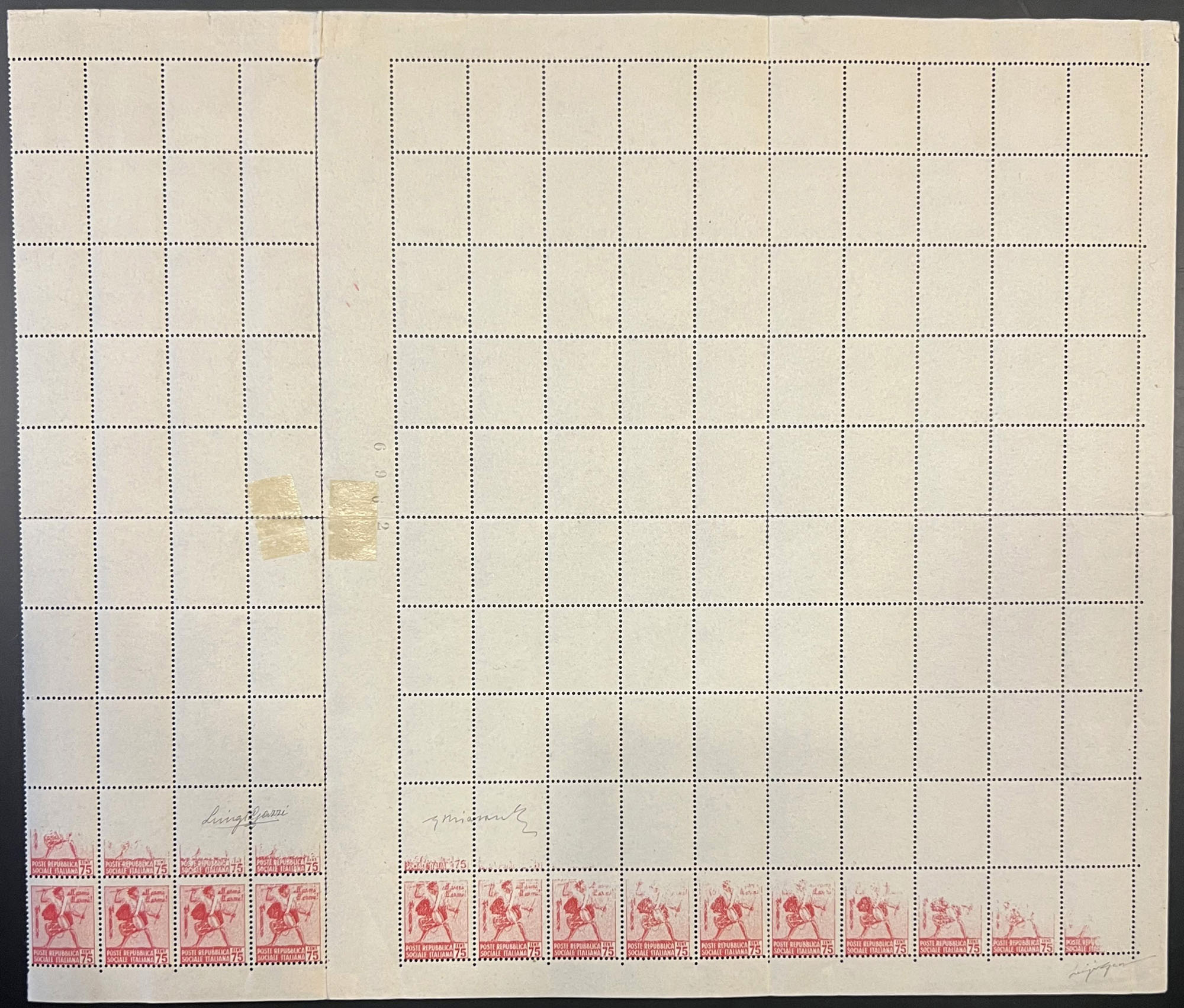 RSI - 75 cent Tamburino (508bc)1944 - 75 cent Tamburino - blocco di 140 pezzi (dal foglio doppio) con interspazio - 14 strisce verticali con impronte parziali e 8 file verticali con parte di una sola impressione in basso - rarità - (508bc)