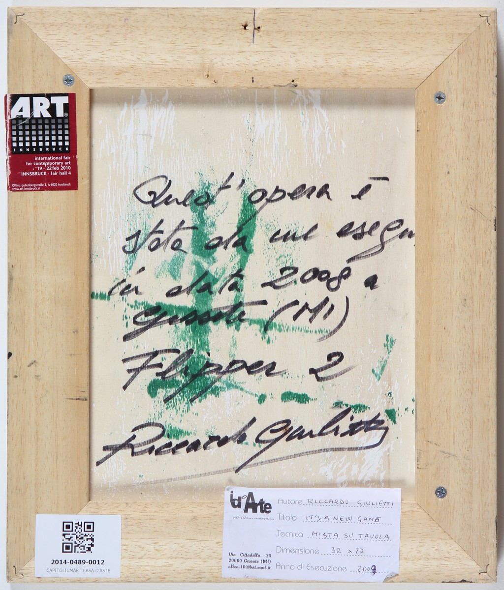 GIULIETTI GUSTAVO (1935 - 2003) It' a new game. Tecnica mista su tavola. Cm 27,00 x 32,00. Al retro firma per autentica, cartiglio descrittivo a cura di Idearte, Gessate, Etichetta di Art, international fair for contemporary art, Innsbruck. Cornice presente