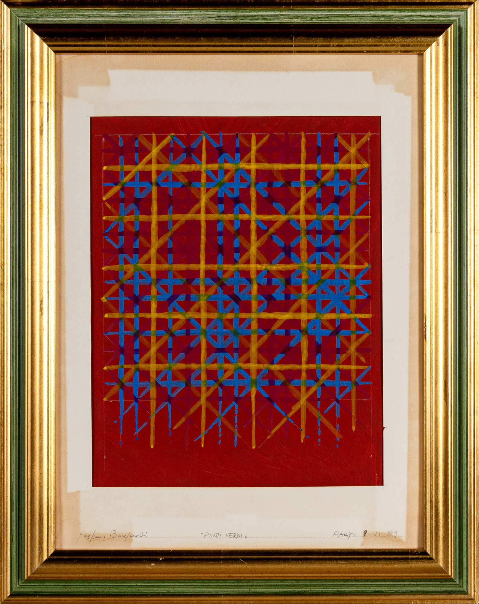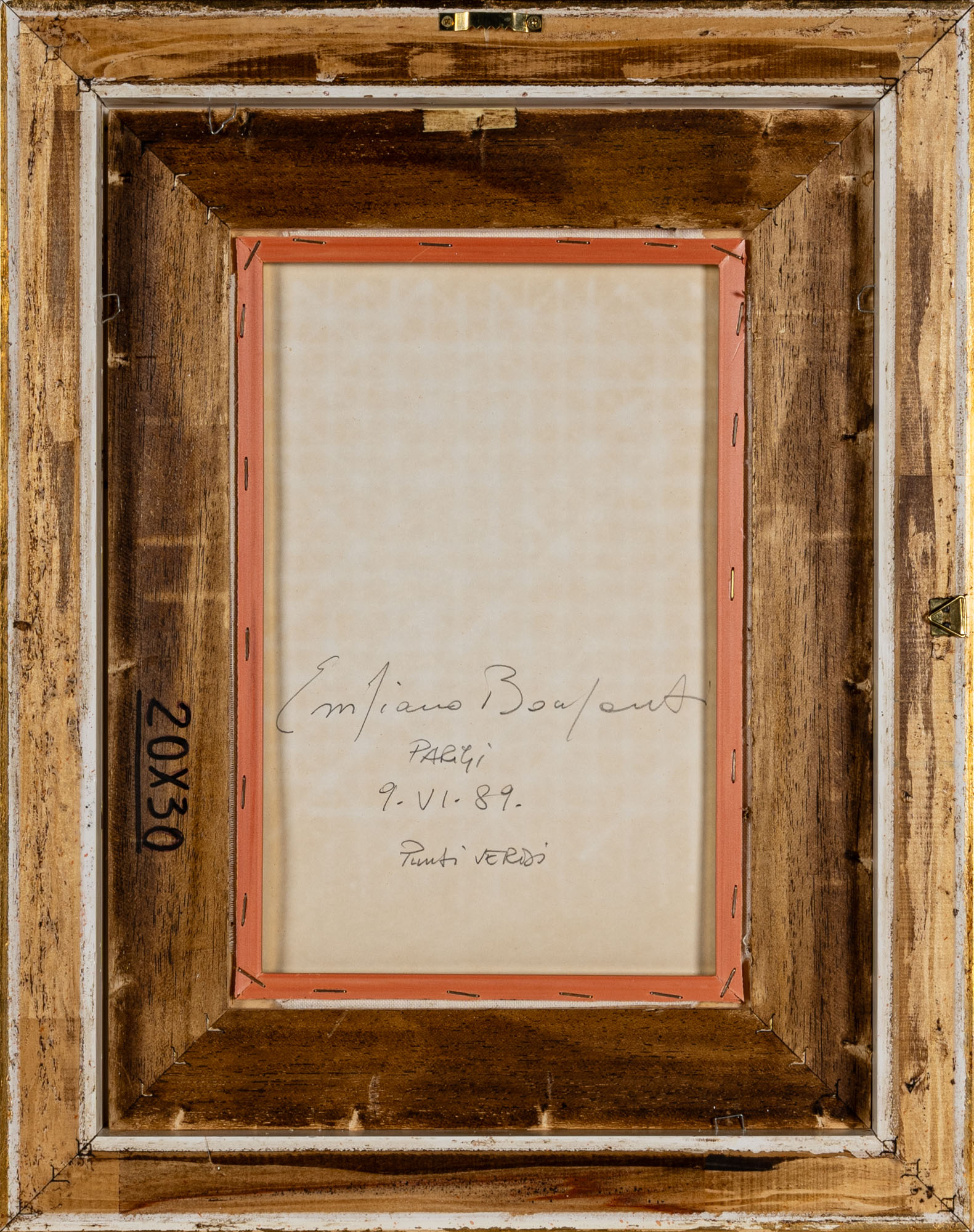EMILIANO BONFANTI(1944)Punti verdi1989Tecnica mista su carta35 x 25 cmFirmata, datata e titolata sul passepartoutFirma, data e titolo al retroPROVENIENZA:Collezione privata, Pavia