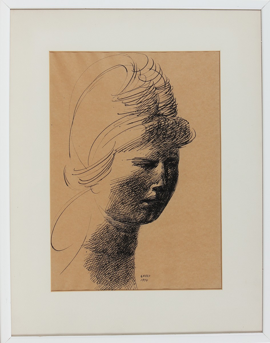 GRECO EMILIO (1913 - 1995) Senza titolo. 1954. Disegno a china su carta. Cm 52,00 x 62,00. Firma e data in basso a destra. Opera archiviata presso la fondazione Emilio Greco, Roma, come da documentazione allegata all' opera, riportante il relativo numero di archivio. Cornice presente