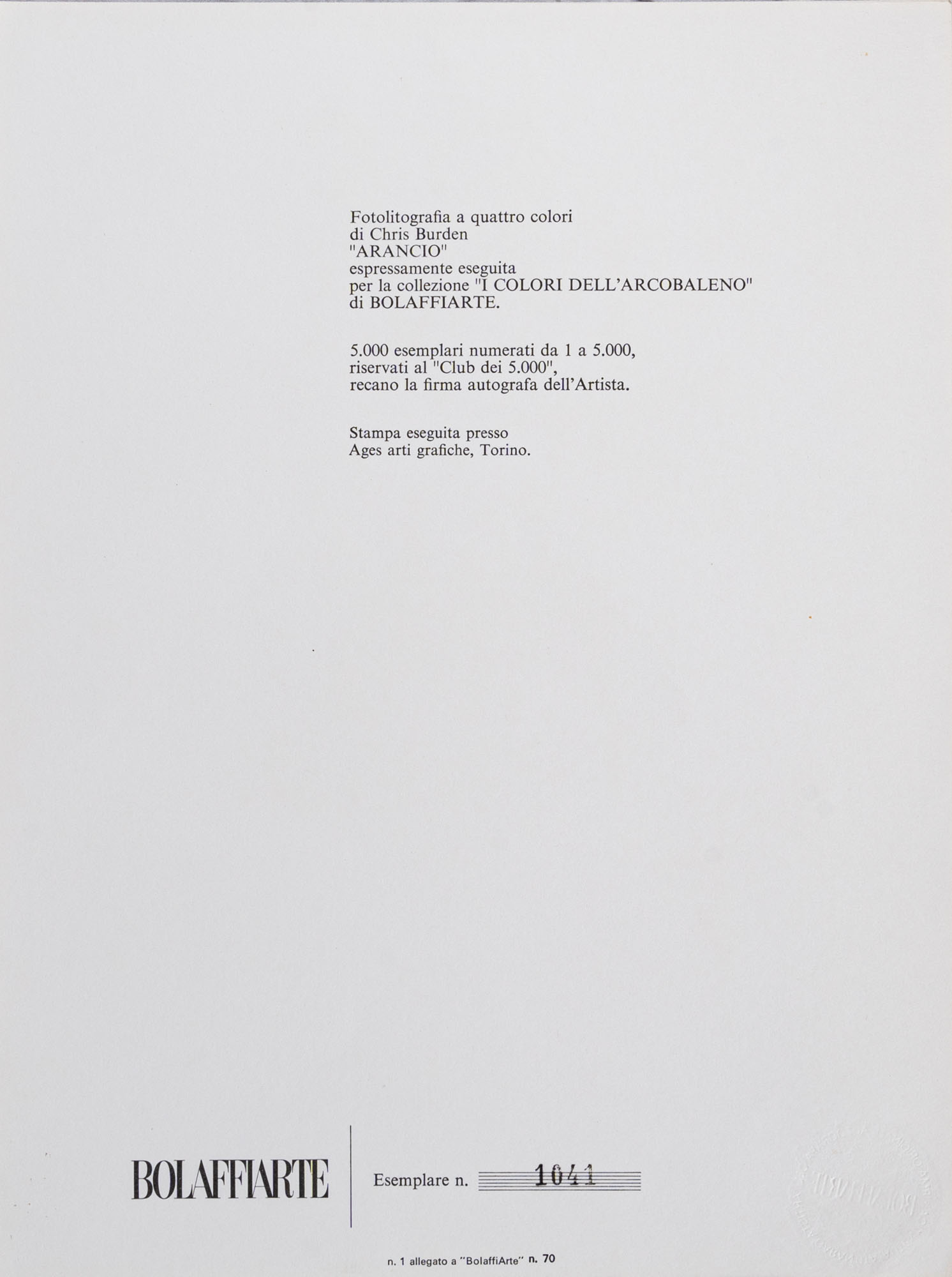 CHRIS BURDEN(1946 - 2015)Arancio1977Litografia con catalogo, es. 1041/500028 x 21 cmSiglata in basso a destraNumerazione al retroPROVENIENZA:Collezione privata, Modena