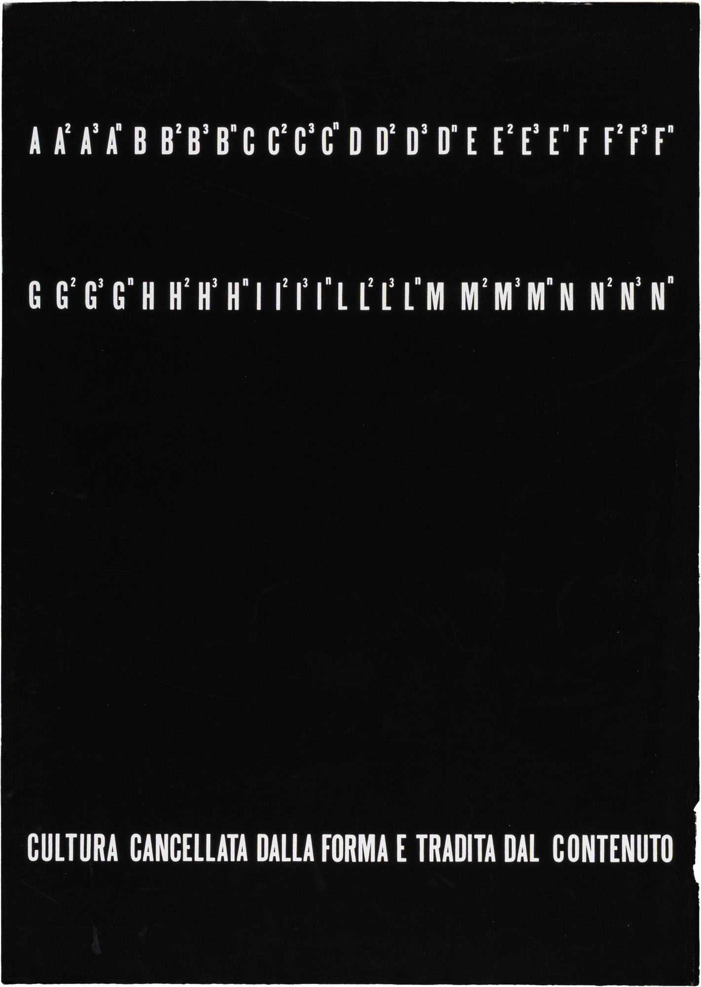 VINCENZO AGNETTI(1926 - 1981)Cultura cancellata dalla forma e tradita dal contenuto1971Serigrafia, es. 30/7575 x 50 cmFirma, data e numerazione al retroPROVENIENZA:Collezione privata, Milano