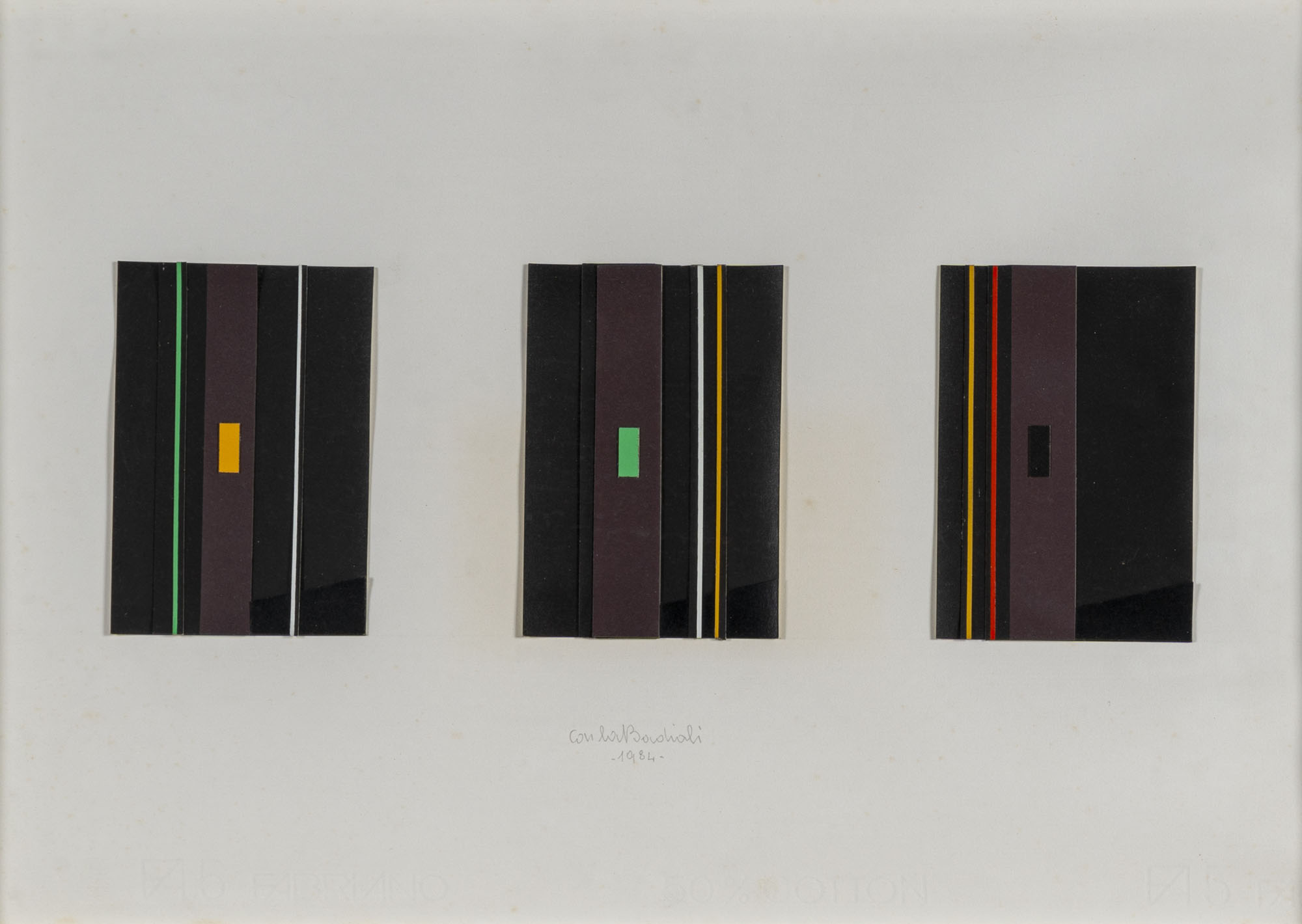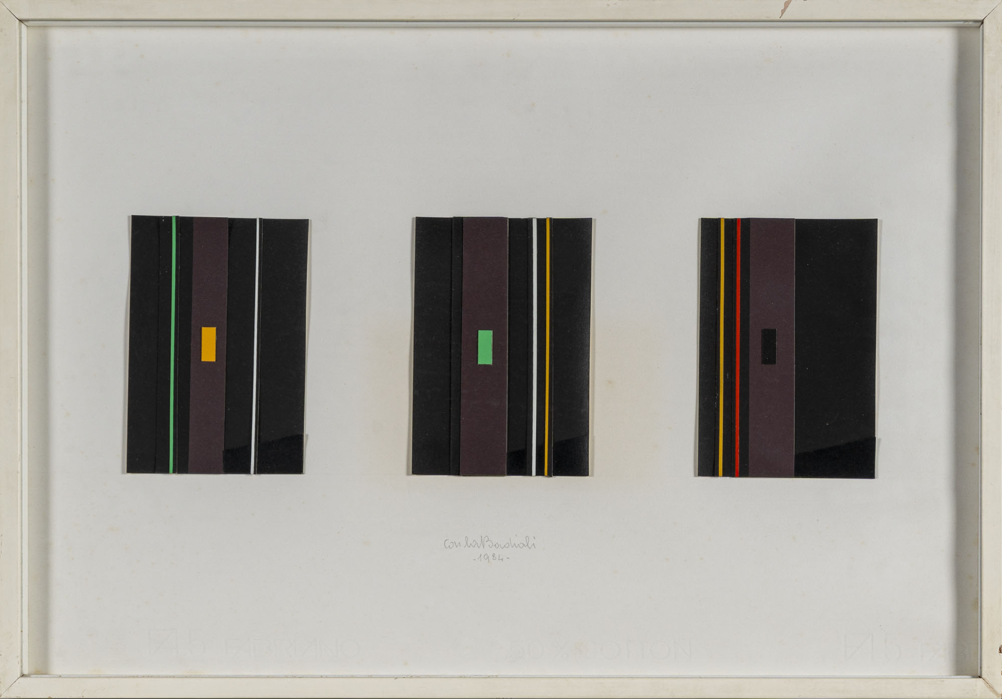 CARLA BADIALI(1907 - 1992)Tre sequenze verticali1984Collage di carte serigrafate applicati su carta Fabriano Cotton35 x 50 cmFirmato e datato in basso al centroFirma, titolo e dichiarazione di autenticità al retroPROVENIENZA:Valente Arte Contemporanea, Finale Ligure (etichetta e timbro al retro)Collezione privata, MilanoESPOSIZIONI:1991, Carla Badiali: opere dal 1937 - 1984, Valente Arte Contemporanea, Finale LigureBIBLIOGRAFIA:Cavadini L., Carla Badiali. Catalogo Generale, Silvana Editoriale, 2008, n. 1984 7-9, p. 177 (ill.)Anzani G., Carla Badiali: opere dal 1937 - 1984, catalogo della mostra tenutasi presso Valente Arte Contemporanea, Finale Ligure, 1991