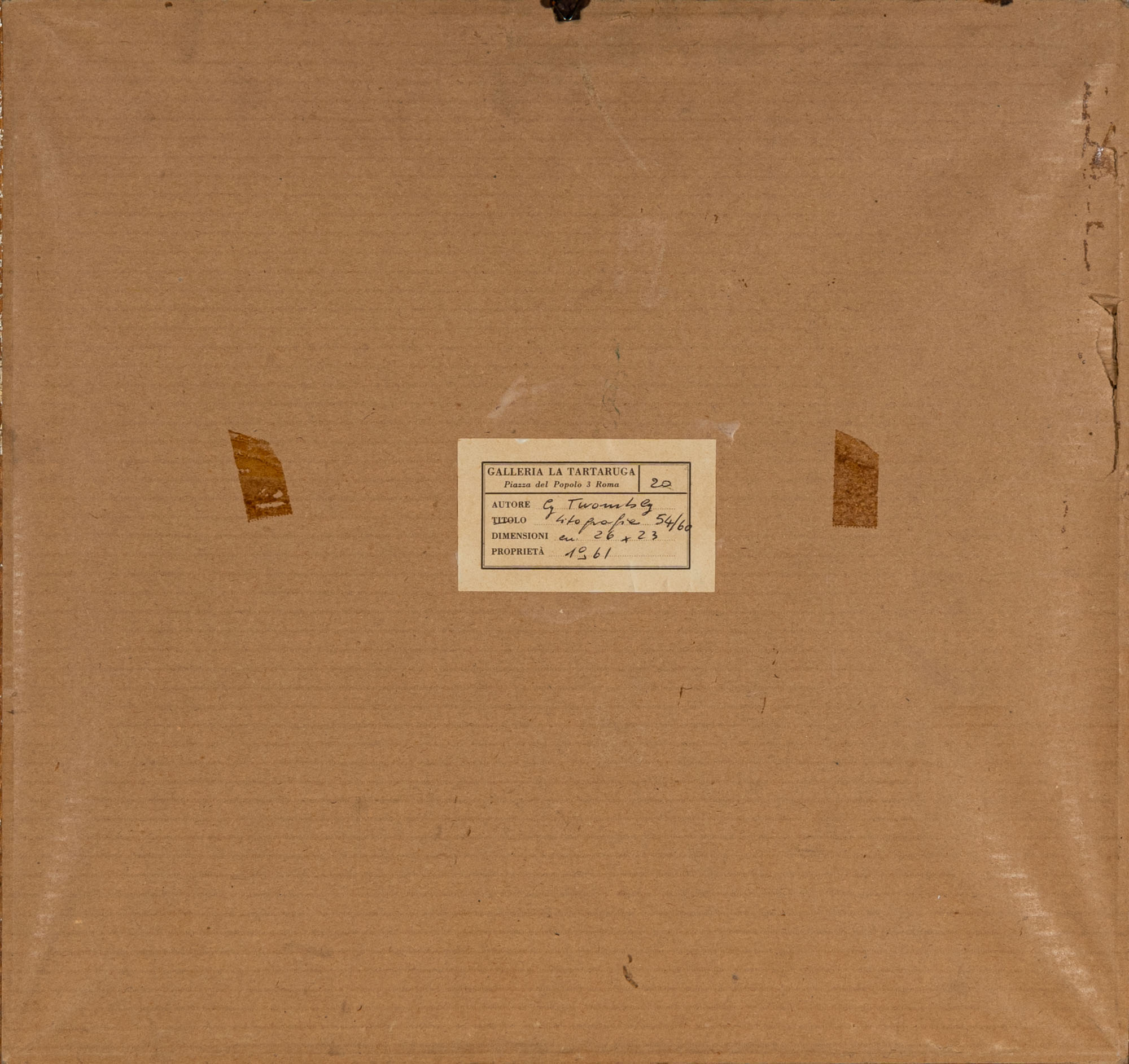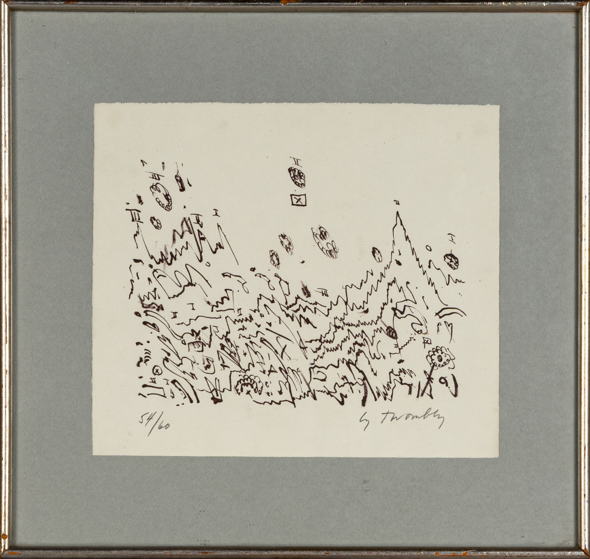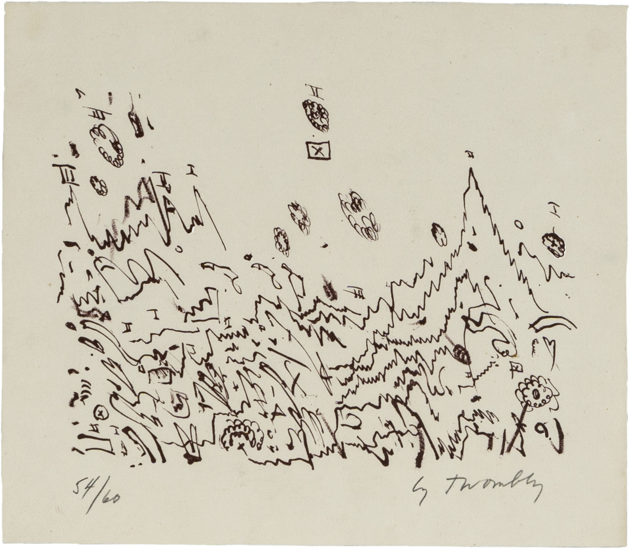CY TWOMBLY(1928 - 2011)Senza titolo1960Litografia, es. 54/60, edizione Galleria La Tartaruga, Roma22,7 x 26,2 cmFirmata a matita in basso a destra e numerata in basso a sinistraPROVENIENZA:Galleria La Tartaruga, Roma (etichetta al retro)Collezione privata, MilanoBIBLIOGRAFIA:H. Bastian, Cy Twombly. Das graphische Werk 1953 - 1984. A catalogue raisonné of the printed graphic work, Edition Schellmann, Munchen - New York, 1985, n. 4, p. 32 (ill.)