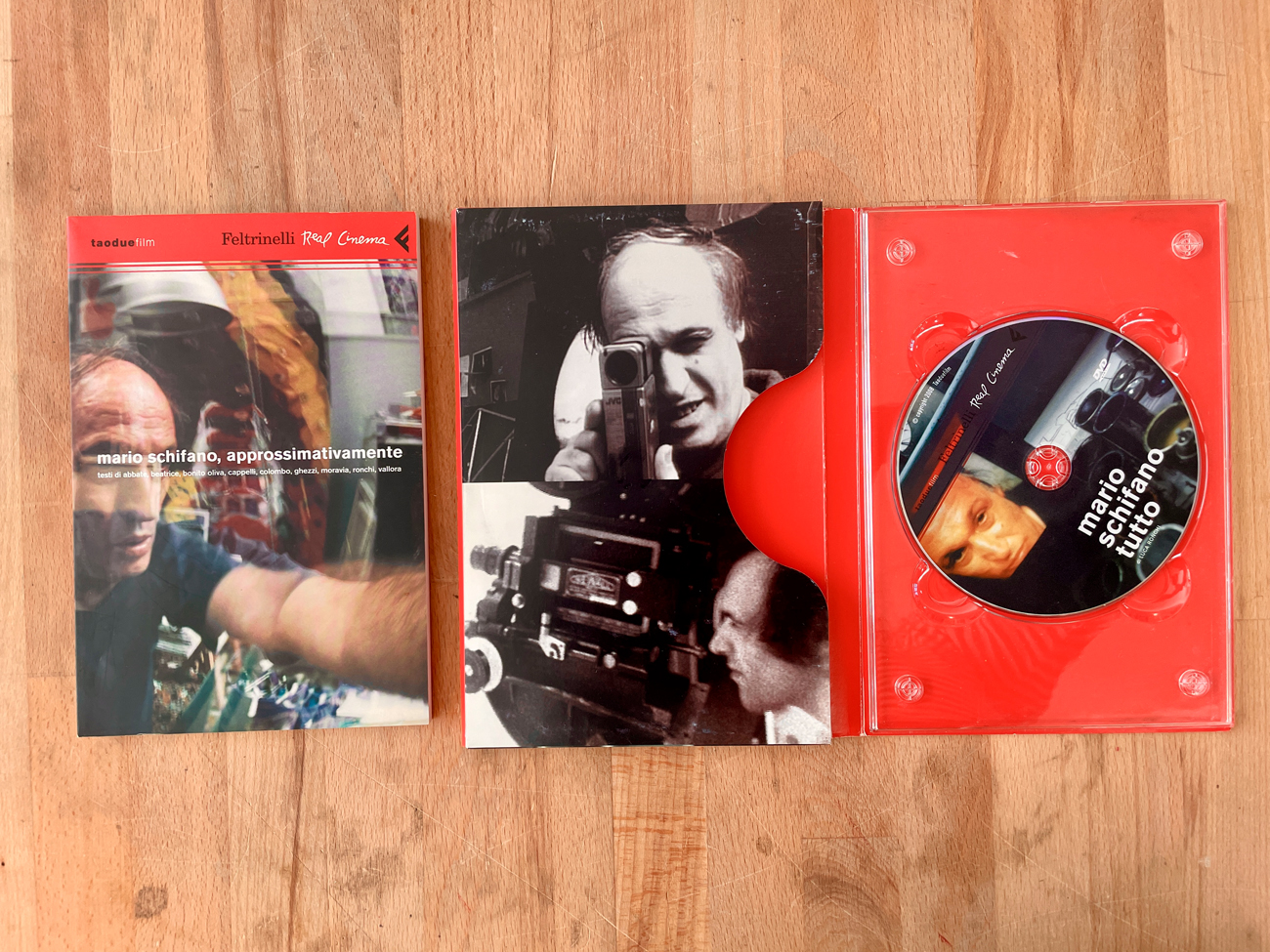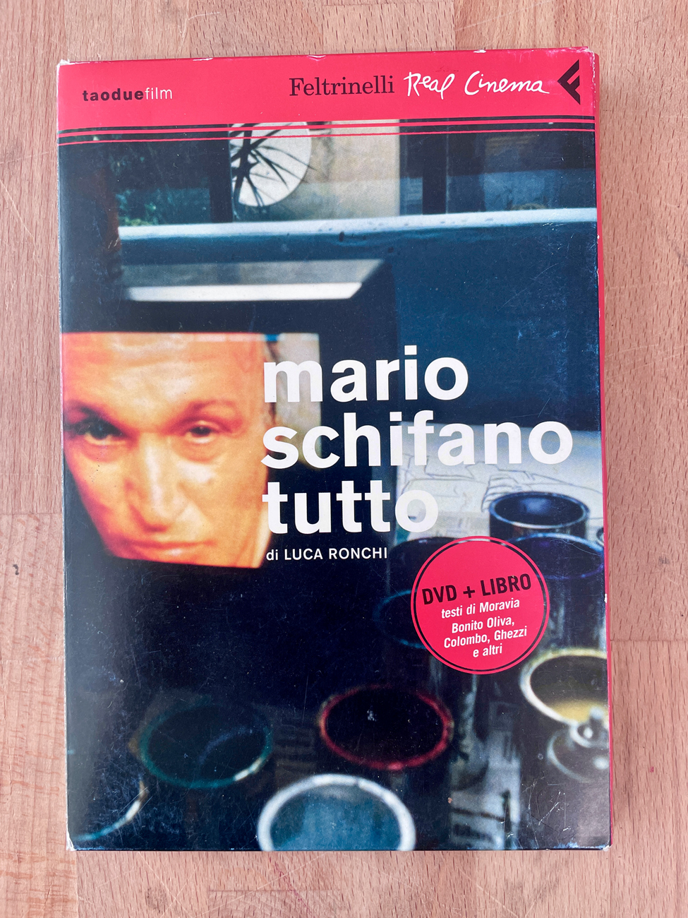 Cofanetto contenente un catalogo riccamente illustrato: 'Mario Schifano, approssimativamente' con testi di Abbate, Beatrice, Bonito Oliva, Cappelli, Colombo, Ghezzi, Moravia, Ronchi, Vallora ed un dvd, entrambi a cura di Luca Ronchi