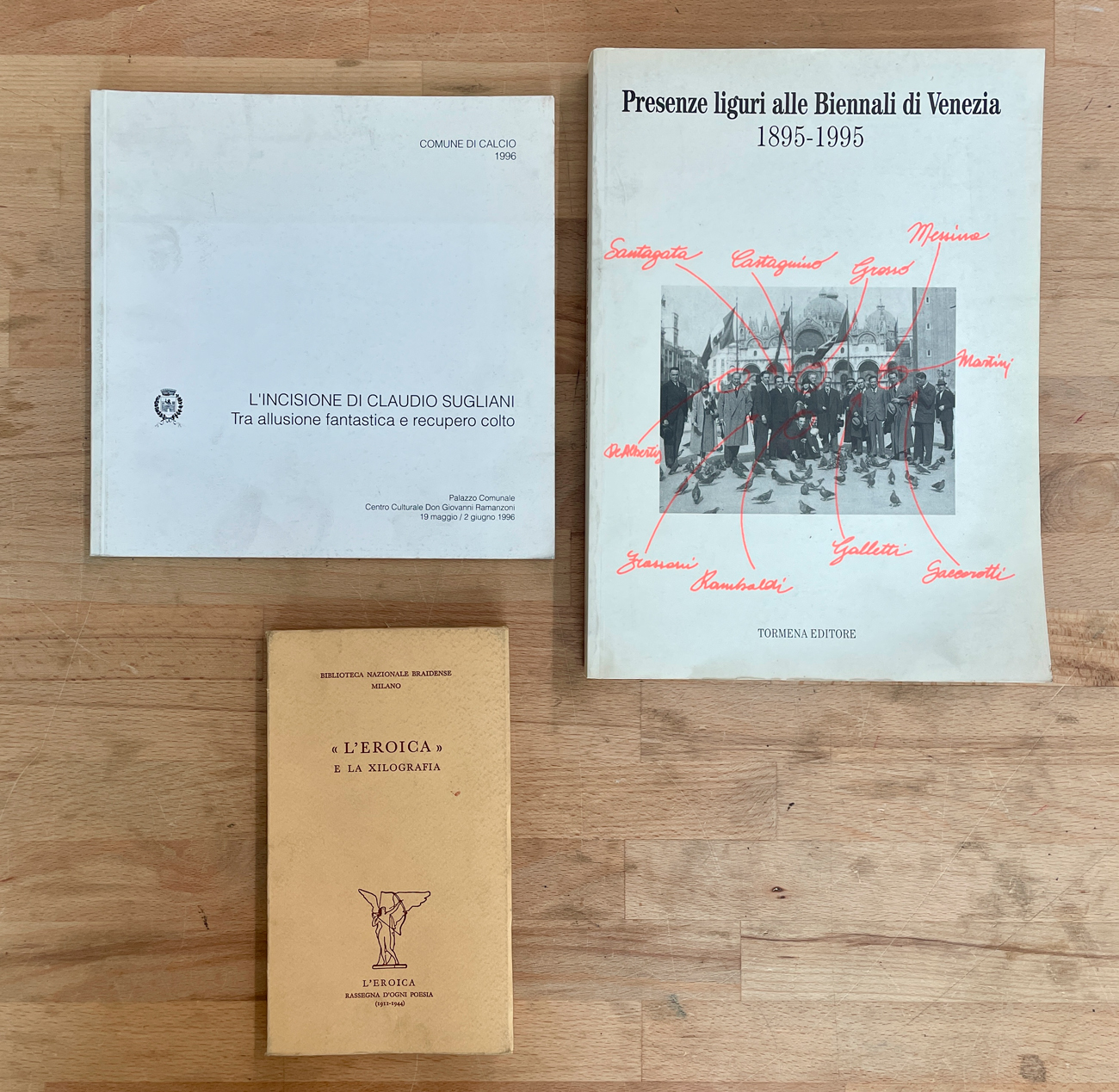 Si allega il catalogo 'L'Eroica e la xilografia' 1981 (Edizione a cura della Biblioteca Nazionale Braidense, Milano) e il catalogo 'L'incisione di Claudio Sugliani. Tra allusione fantastica e recupero colto' 1996 (Edizione a cura del Comune di Calcio)