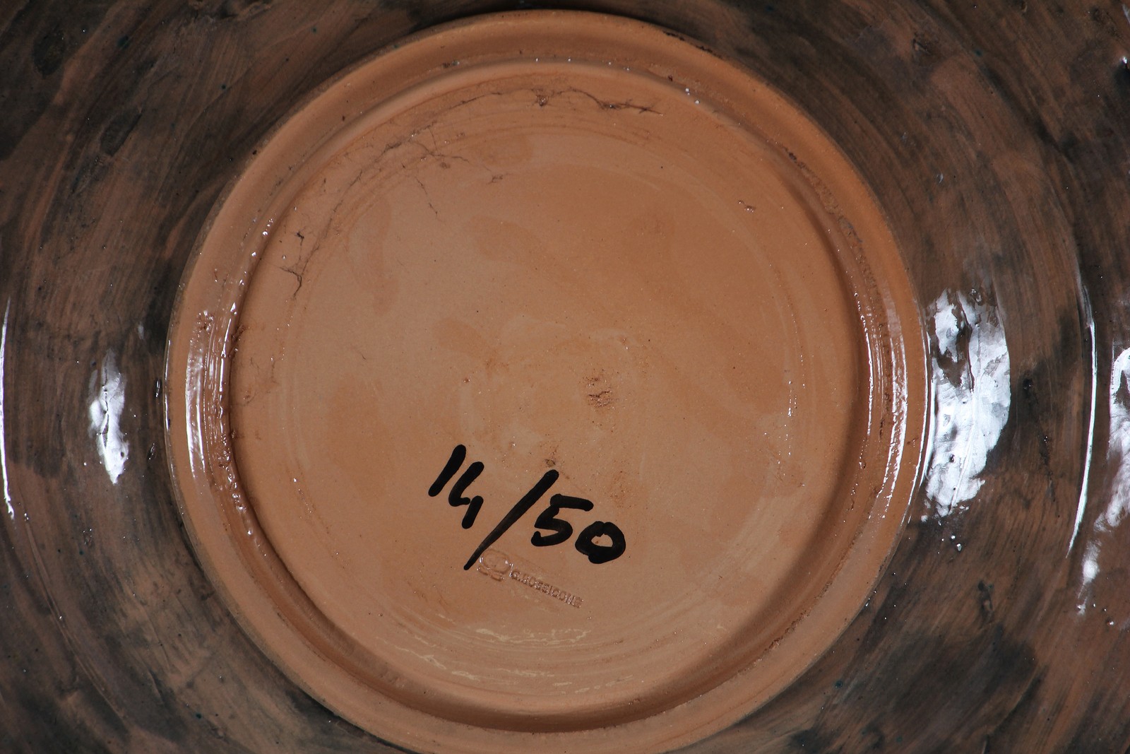 FIUME SALVATORE (1915 - 1997) Senza titolo. Ceramica. Cm 50,00. Piatto in ceramica firmato e decorato a mano. Multiplo15/50. Al retro reca la scritta incisa G.Rossicone.