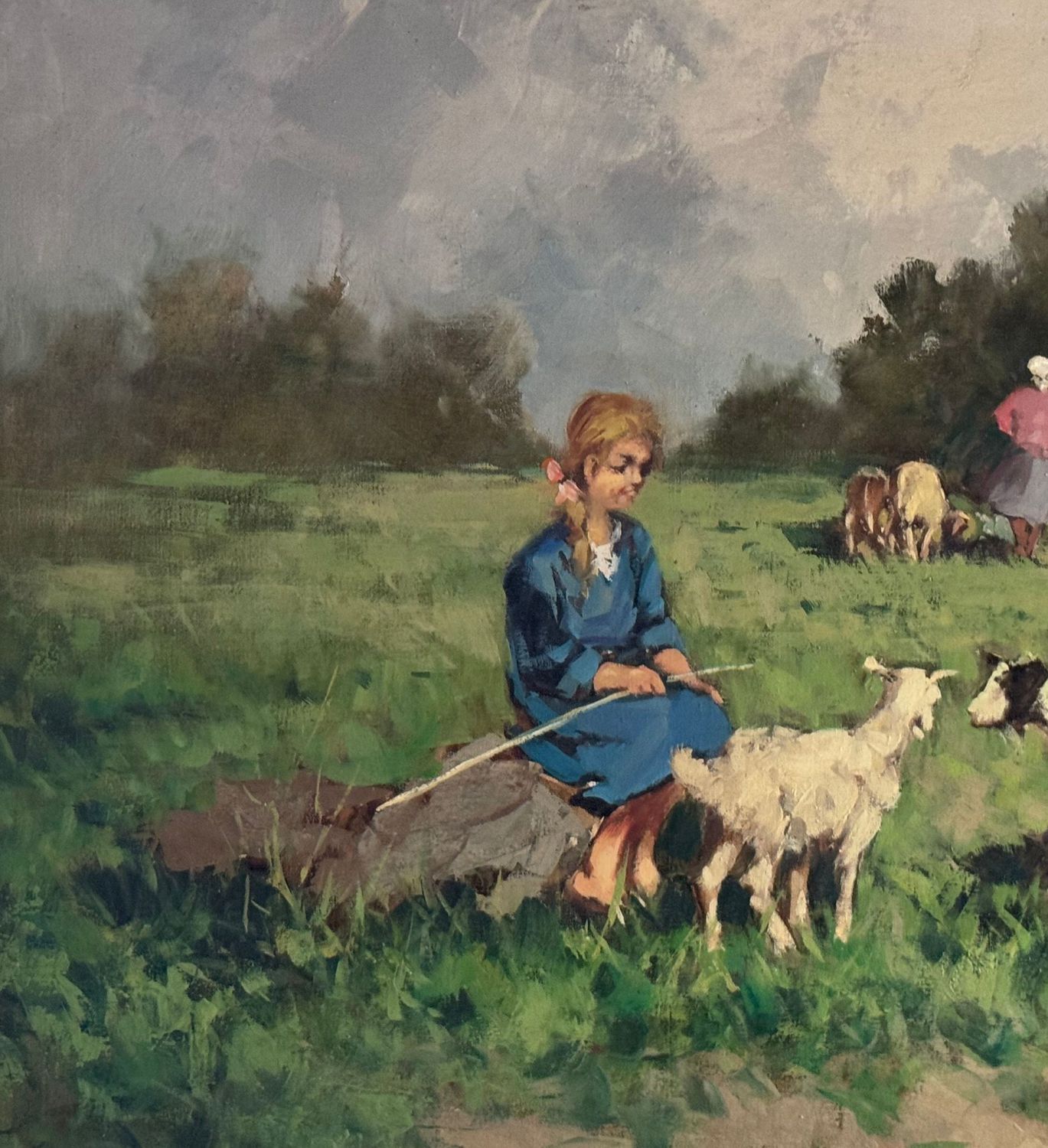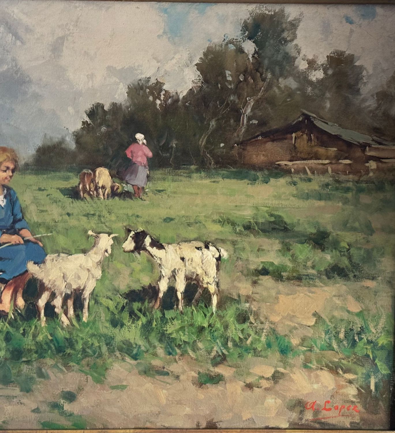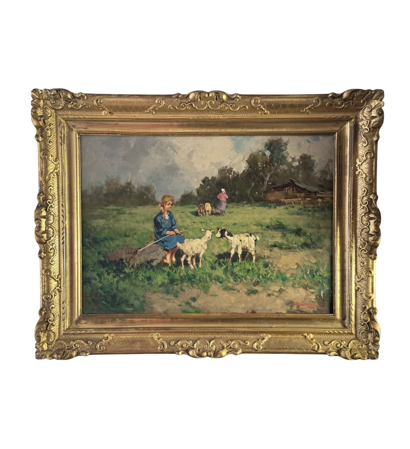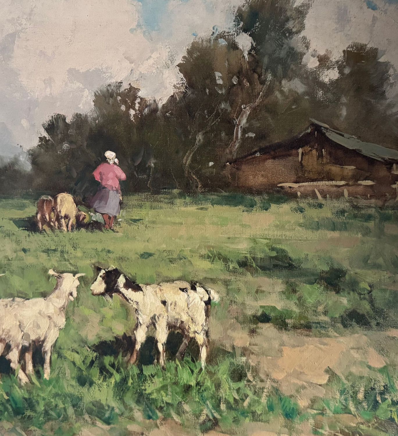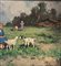 Dipinto olio su tela, periodo XX secolo scuola Italiana, raffigurante Paesaggio di campagna con personaggi e caprette. Dimensioni compreso cornice: 90x70 cm. Dimensioni interno cornice: 70x50 cm. Reca firma in basso a destra. Opera in buone condizioni.