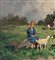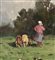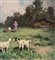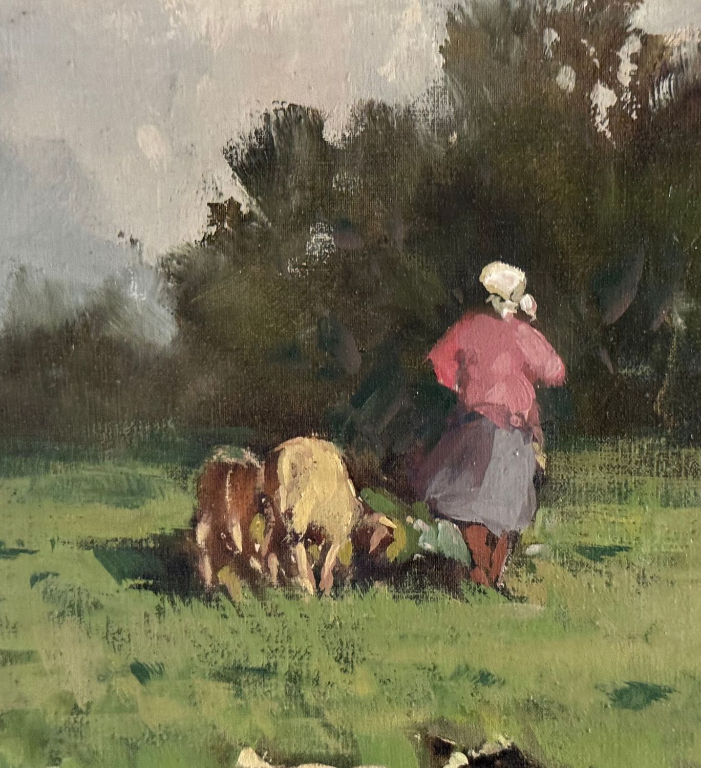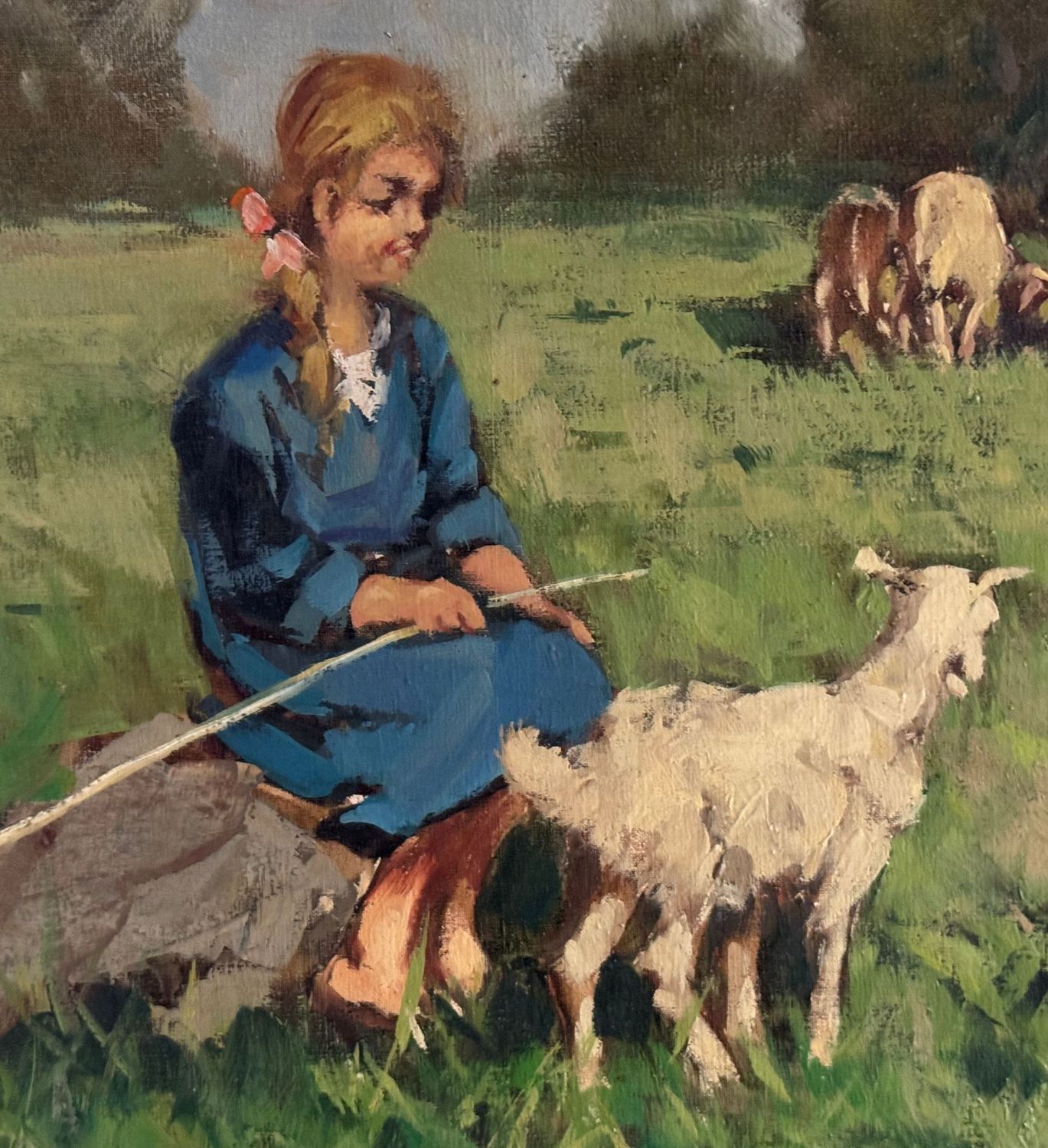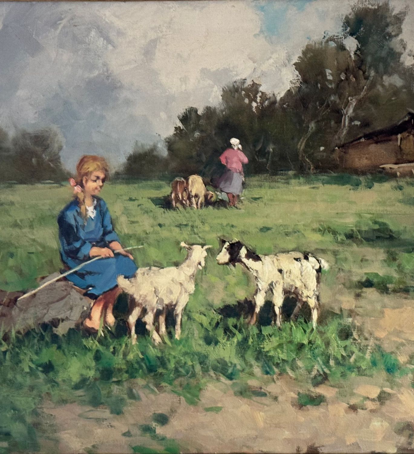 Dipinto olio su tela, periodo XX secolo scuola Italiana, raffigurante Paesaggio di campagna con personaggi e caprette. Dimensioni compreso cornice: 90x70 cm. Dimensioni interno cornice: 70x50 cm. Reca firma in basso a destra. Opera in buone condizioni.