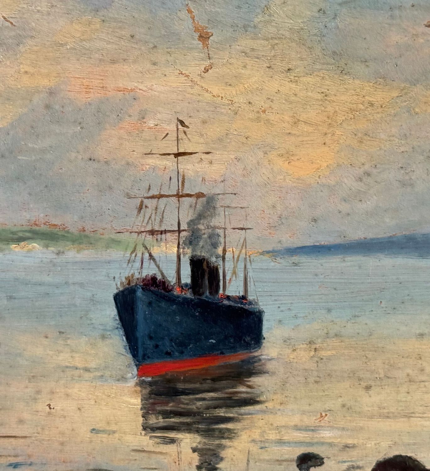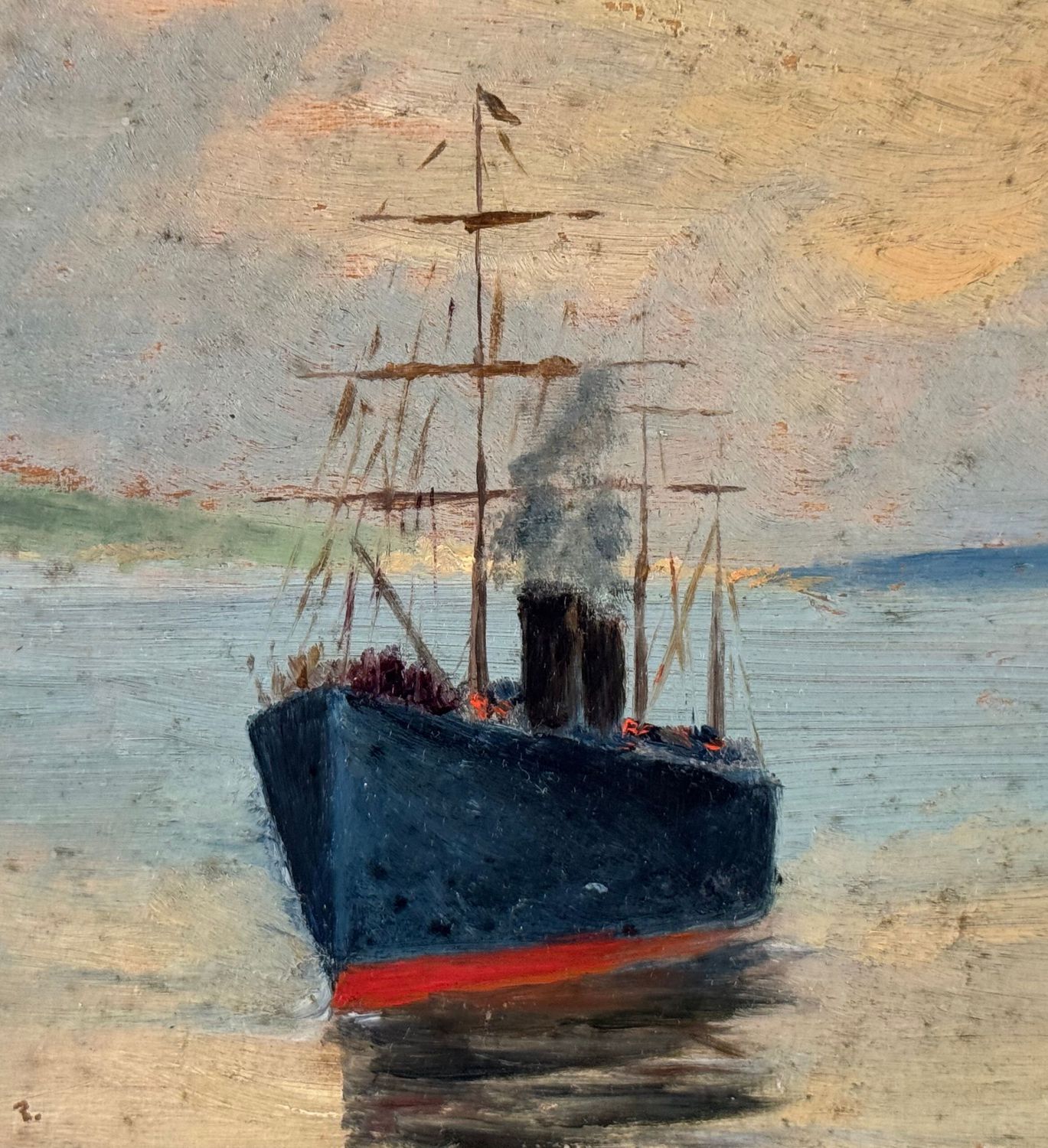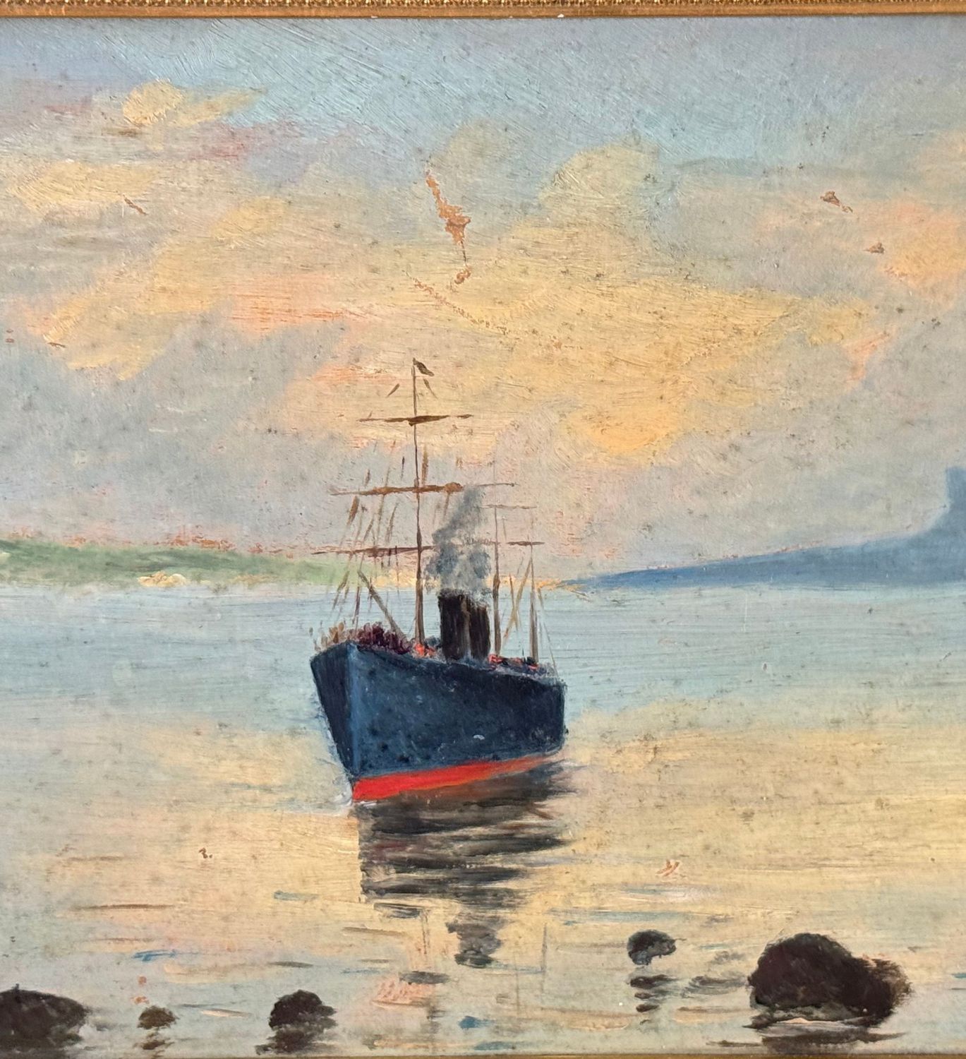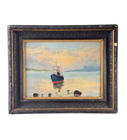 Dipinto olio su tavola, periodo XIX secolo scuola Napoletana, raffigurante Scorcio di marina con vapore. Dimensioni compreso cornice: 49x40. Dimensioni interno cornice: 35x25 cm. Opera in buone condizioni.