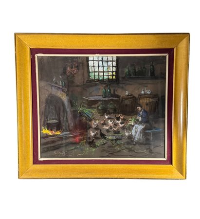 Dipinto olio e gessetto su tavola, periodo XX secolo scuola Italiana, raffigurante Interno con galline. Dimensioni compreso cornice: 101x86 cm. Dimensioni interno cornice: 80x60 cm. Reca firma in basso a sinistra R. Carignani. Opera in buone condizioni.