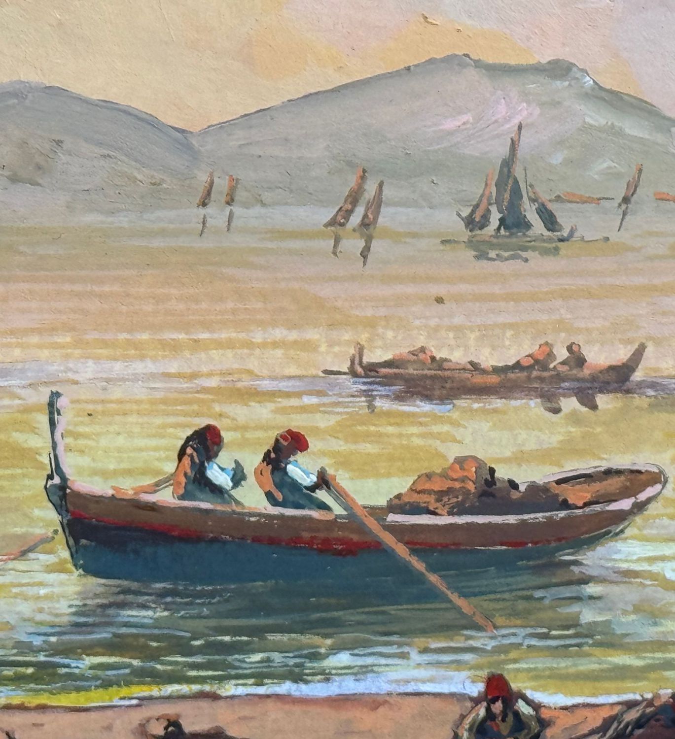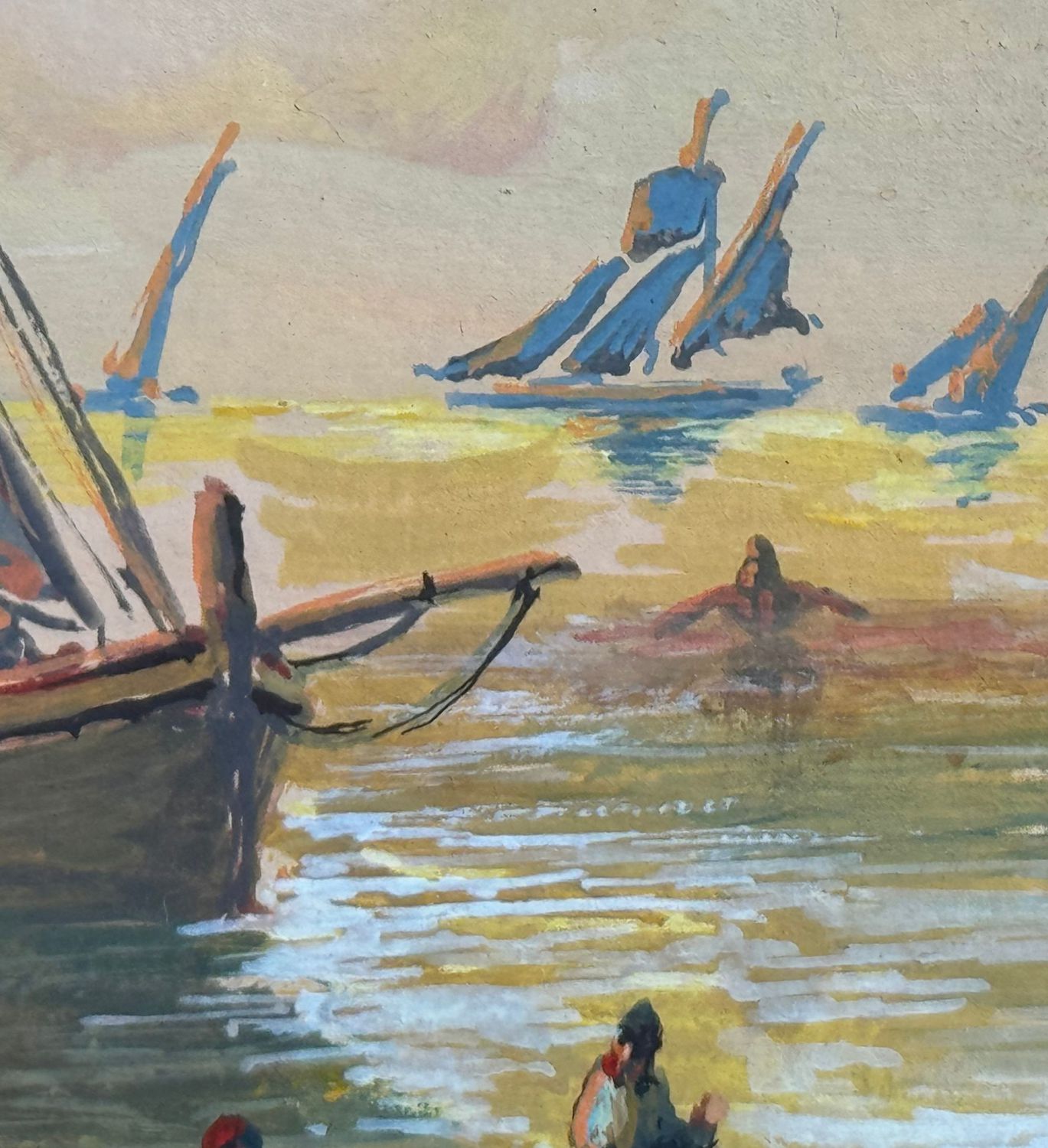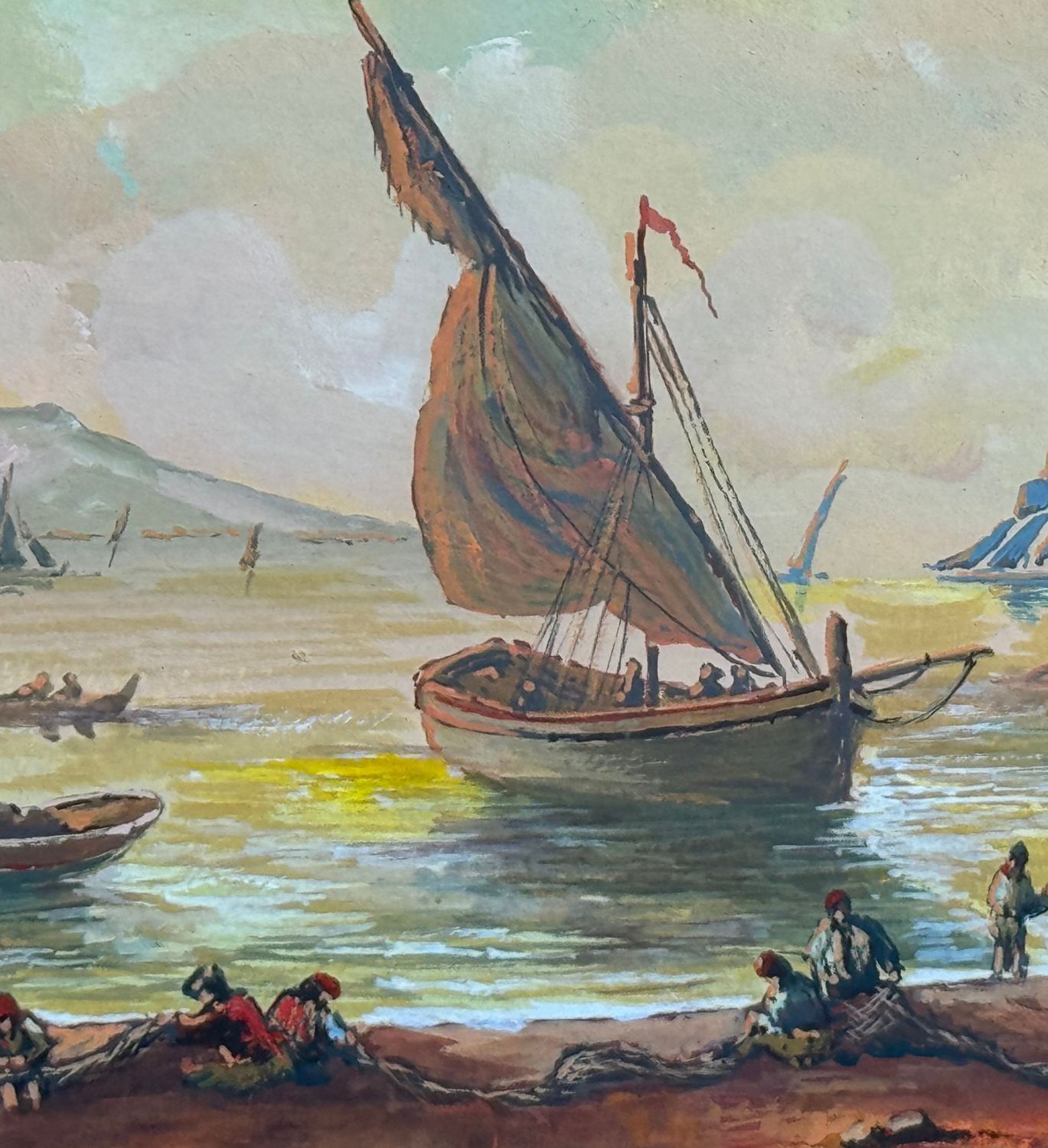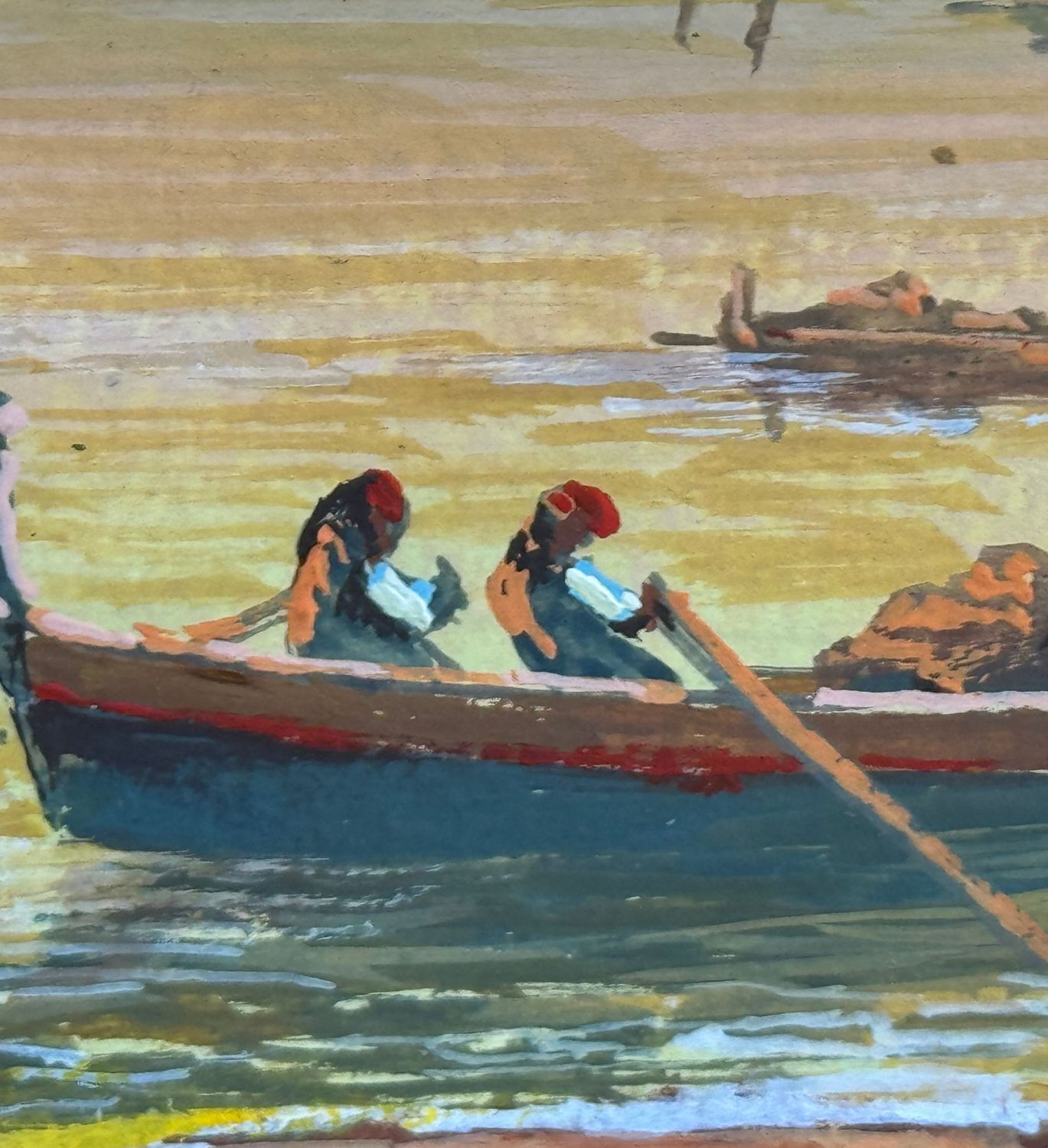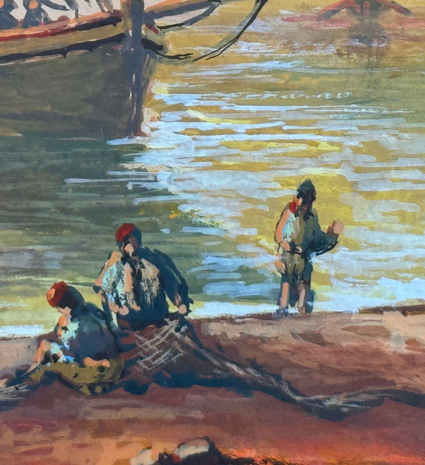 Dipinto guazzo (tempera su carta), periodo XX secolo scuola Italiana, raffigurante Pescatori. Dimensioni compreso cornice: 43x36 cm. Dimensioni interno cornice: 23x16 cm. Da artista anonimo. Opera in buone condizioni.