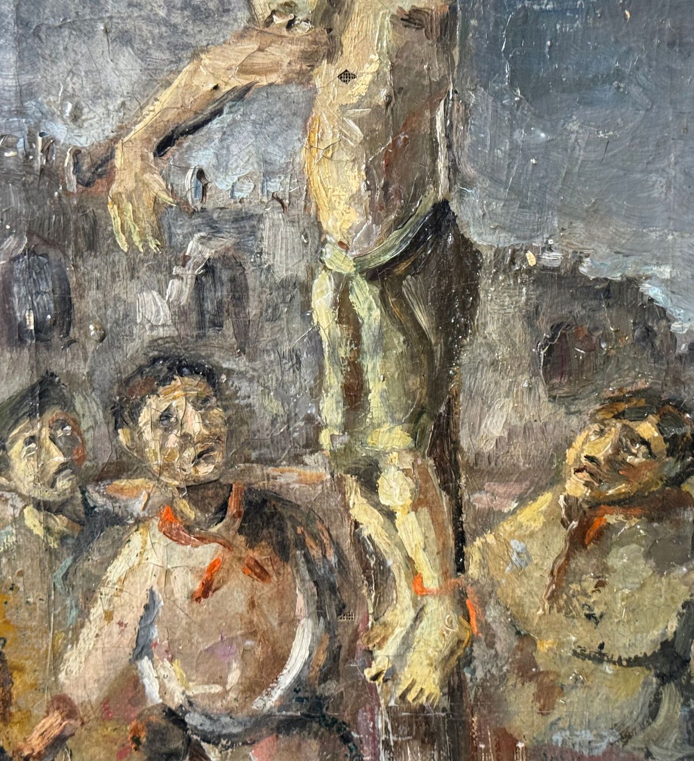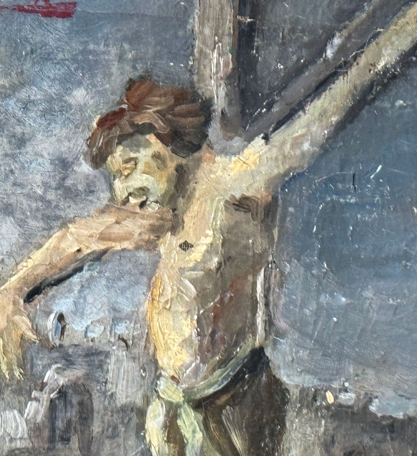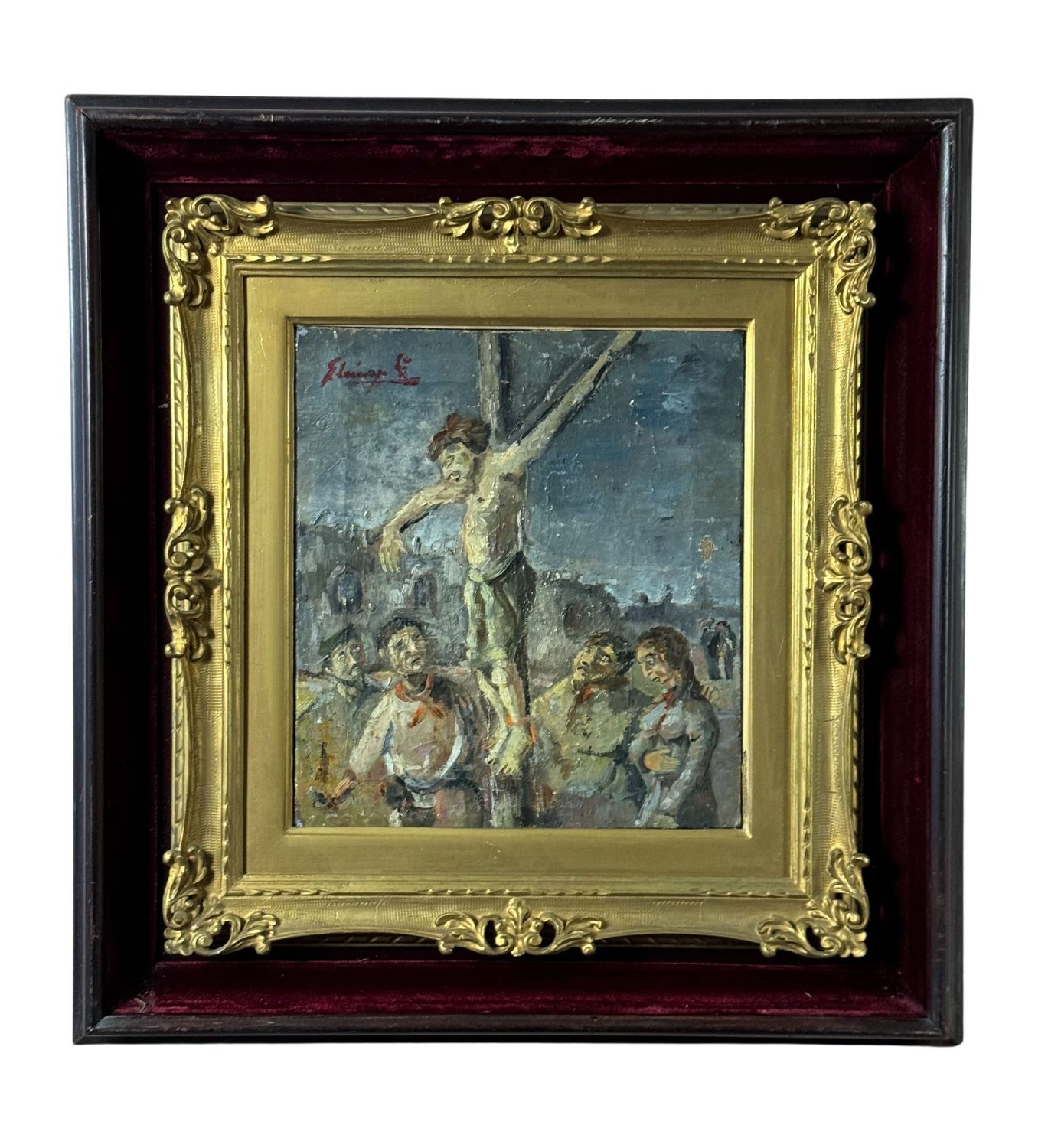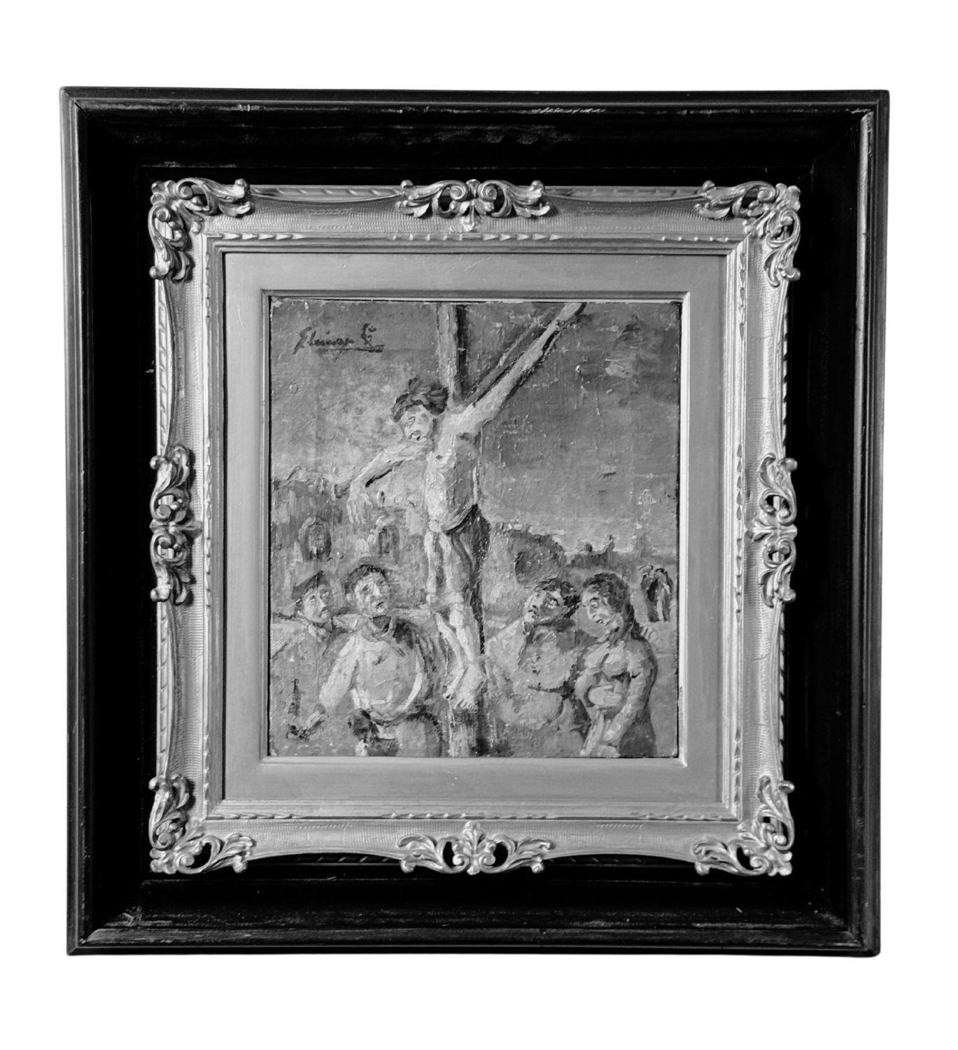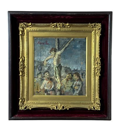 Dipinto olio su tela, periodo XX secolo scuola Italiana, raffigurante Cristo sulla croce. Dimensioni compreso cornice: 54x57 cm. Dimensioni interno cornice: 27x30 cm. Reca firma in alto a sinistra da artista non identificato. Opera in discrete condizioni con piccole cadute di colore.