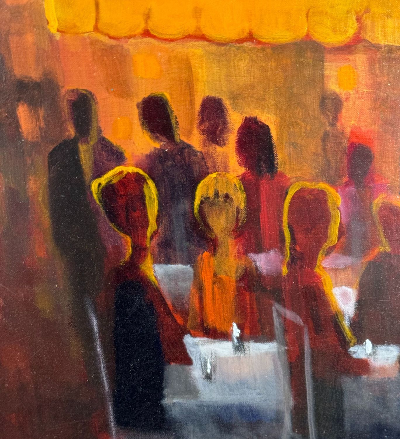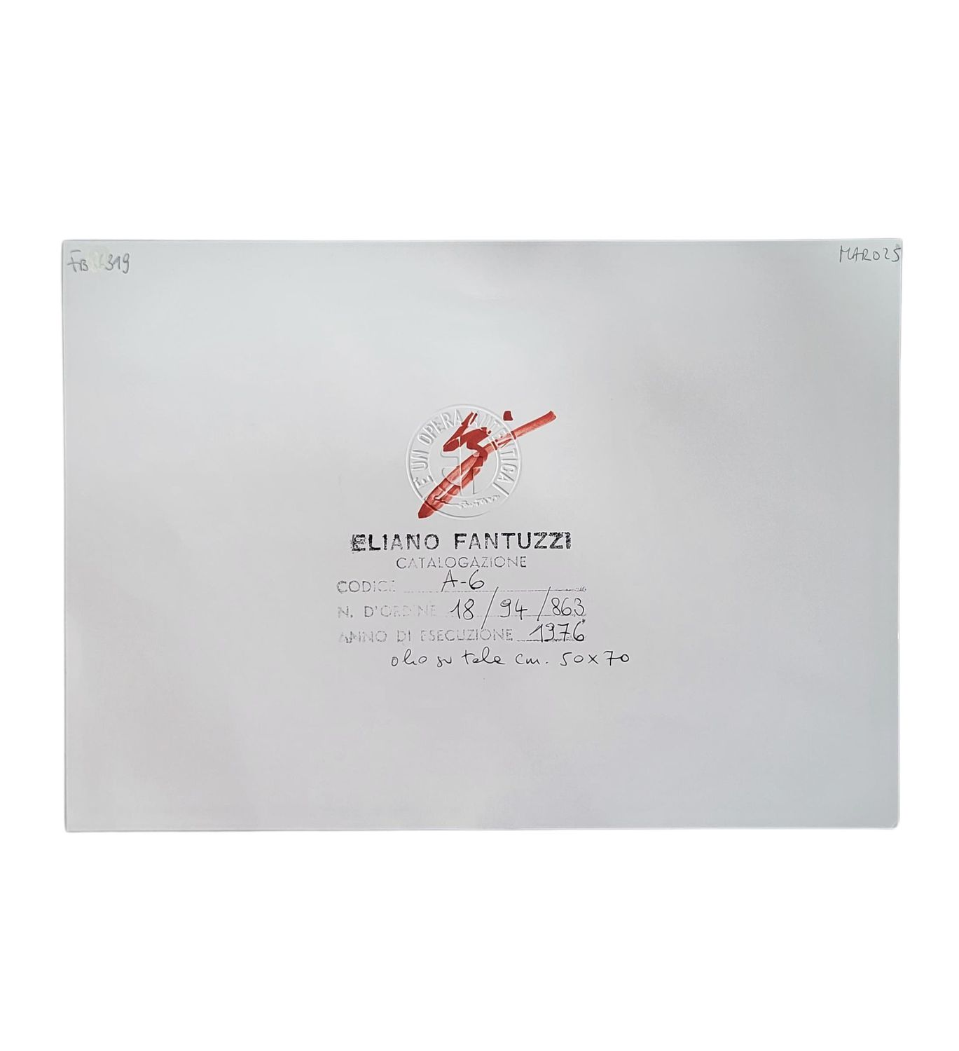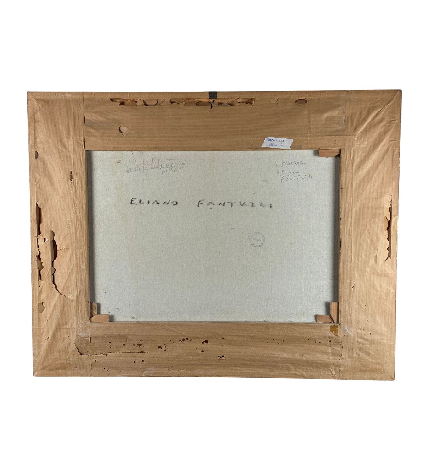 Dipinto olio su tela, periodo XX secolo scuola Italiana, raffigurante Personaggi al bristot. Dimensioni compreso cornice: 92x72 cm. Dimensioni interno cornice: 70x50 cm. Reca firma in basso a sinistra, sul retro con timbro galleria e dedica del pittore Eliano Fantuzzi (Modena, 25 settembre 1909 – Verona, 1987). Opera in buone condizioni.