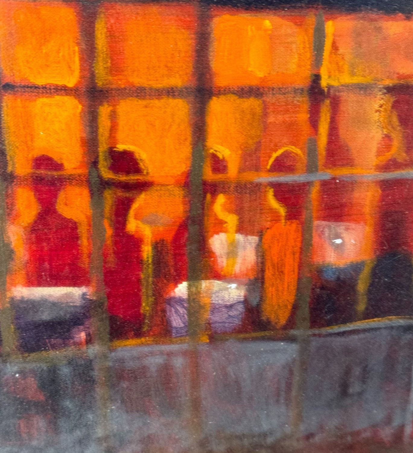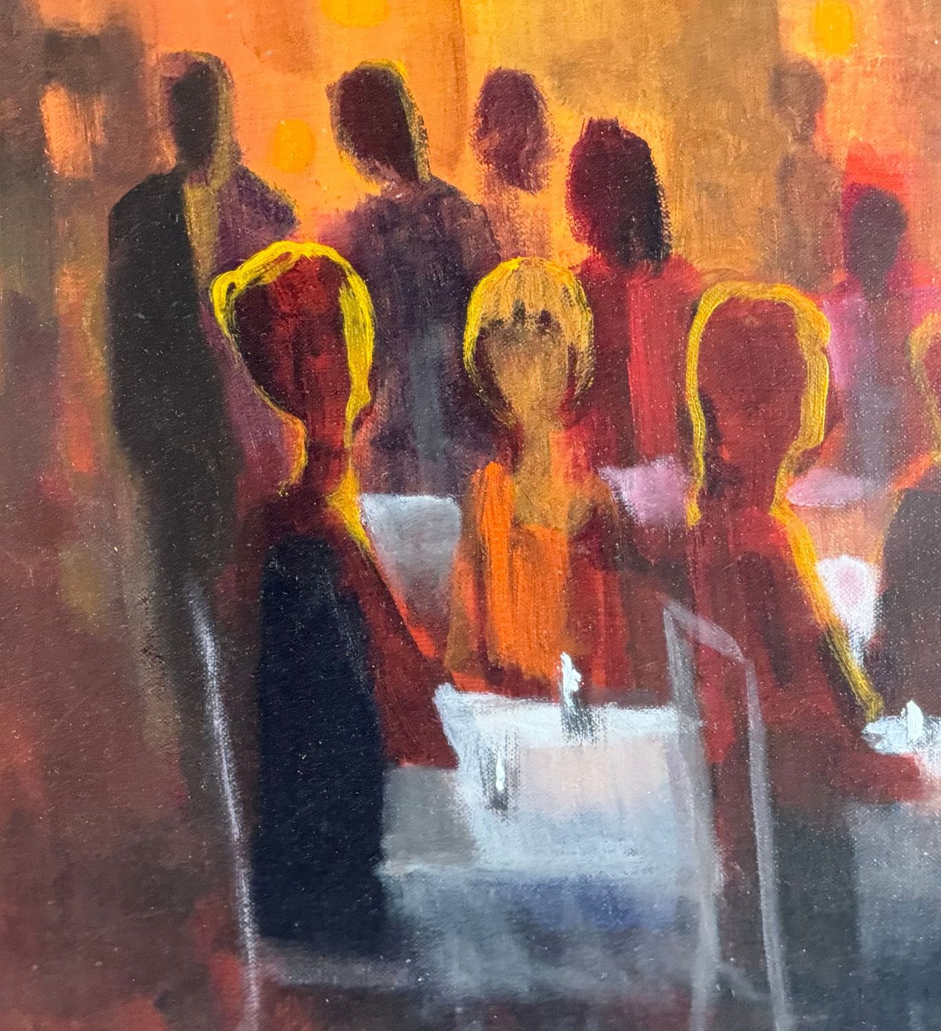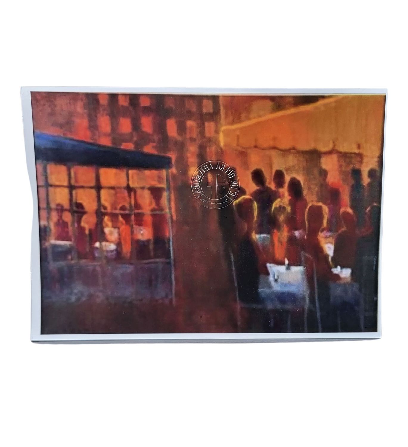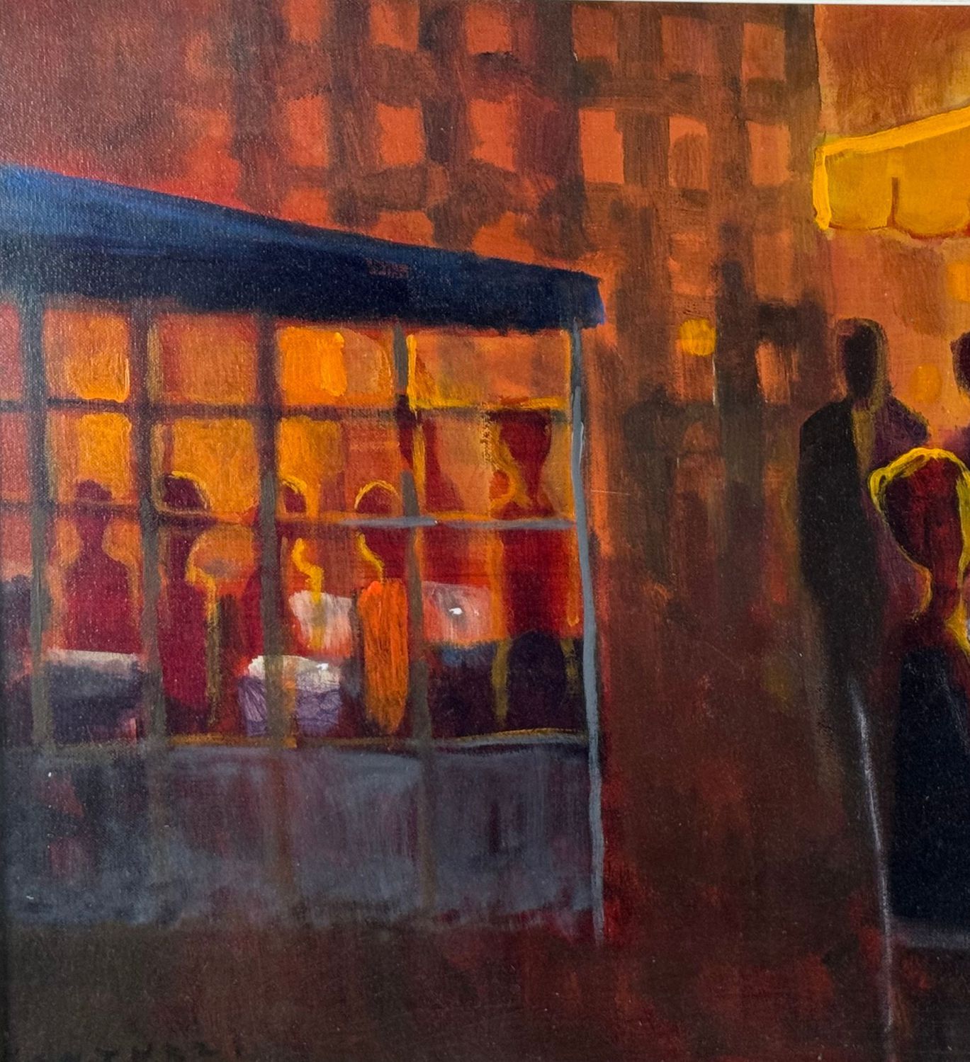 Dipinto olio su tela, periodo XX secolo scuola Italiana, raffigurante Personaggi al bristot. Dimensioni compreso cornice: 92x72 cm. Dimensioni interno cornice: 70x50 cm. Reca firma in basso a sinistra, sul retro con timbro galleria e dedica del pittore Eliano Fantuzzi (Modena, 25 settembre 1909 – Verona, 1987). Opera in buone condizioni.