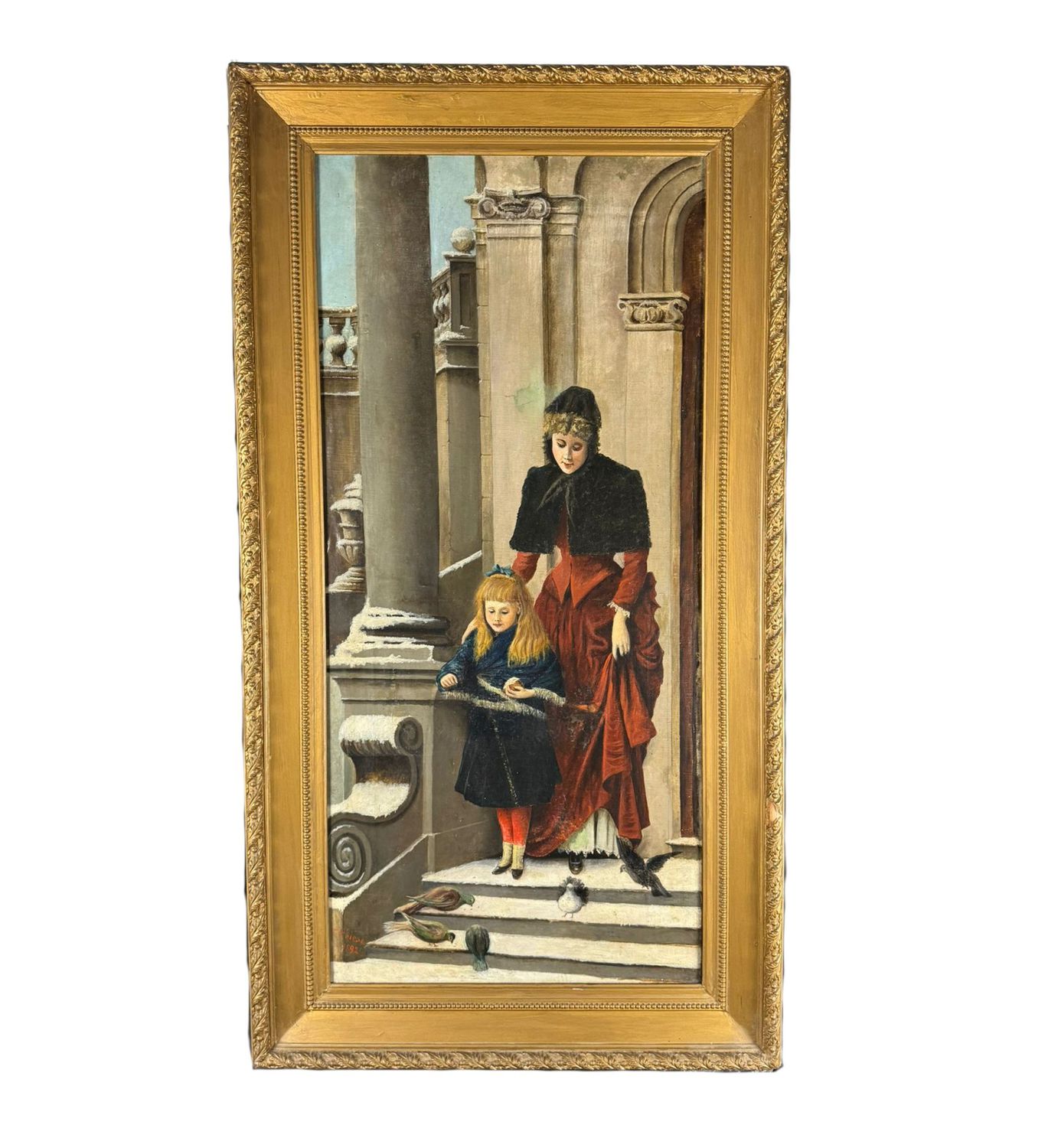 Dipinto olio su tela, periodo XIX secolo scuola Italiana, raffigurante Scena materna con uccellini. Dimensioni compreso cornice: 57x105 cm. Dimensioni interno cornice: 42x90 cm. Reca firma in basso a sinistra da artista non identificato. Opera in buone condizioni. Da segnalare cinque sparsi punti di restauro.