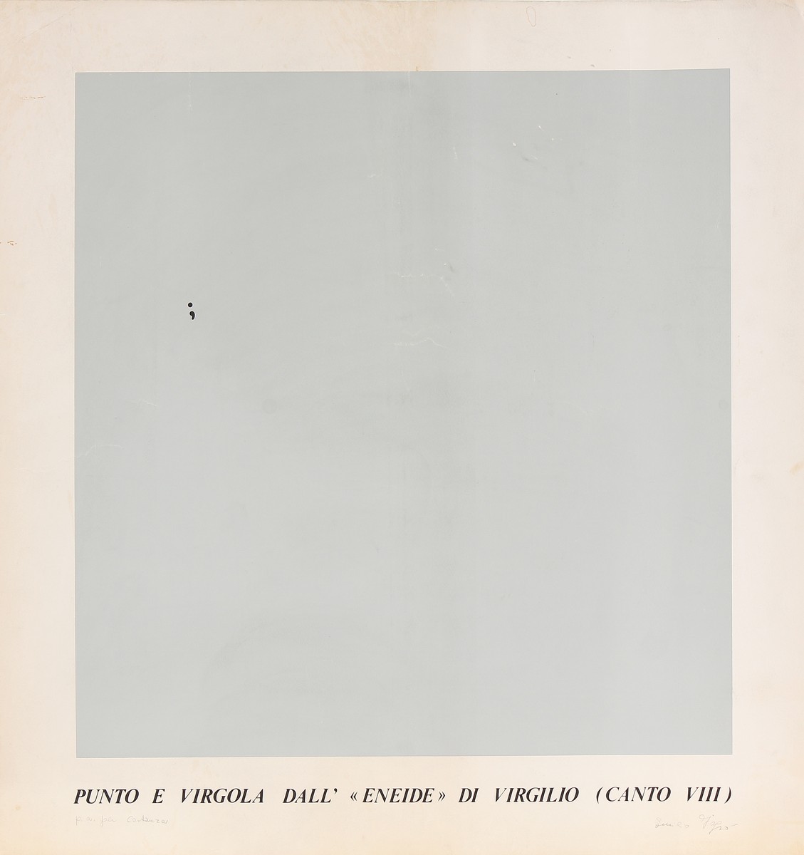 ISGRO' EMILIO (n. 1937) Punto e virgola dall'Eneide di Virgilio (canto VIII). 1974. Litografia. Cm 66,00 x 69,00. P.a. Tiratura, dedica e firma a matita in basso. Al retro dedica dell'artista datata 1994. Al centro la carta risulta lievemente danneggiata.