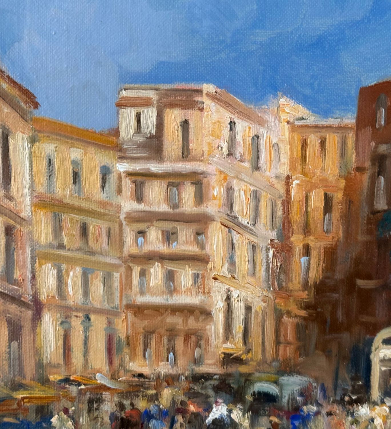 Dipinto olio su pannello, periodo XX secolo, scuola Italiana, raffigurante Strada di città partenopea con personaggi. Dimensioni compreso cornice: 51x45 cm. Dimensioni interno cornice: 30x24 cm. Reca firma in basso a sinistra e autentica sul retro Vincenzo Laricchia. Opera in buone condizioni.