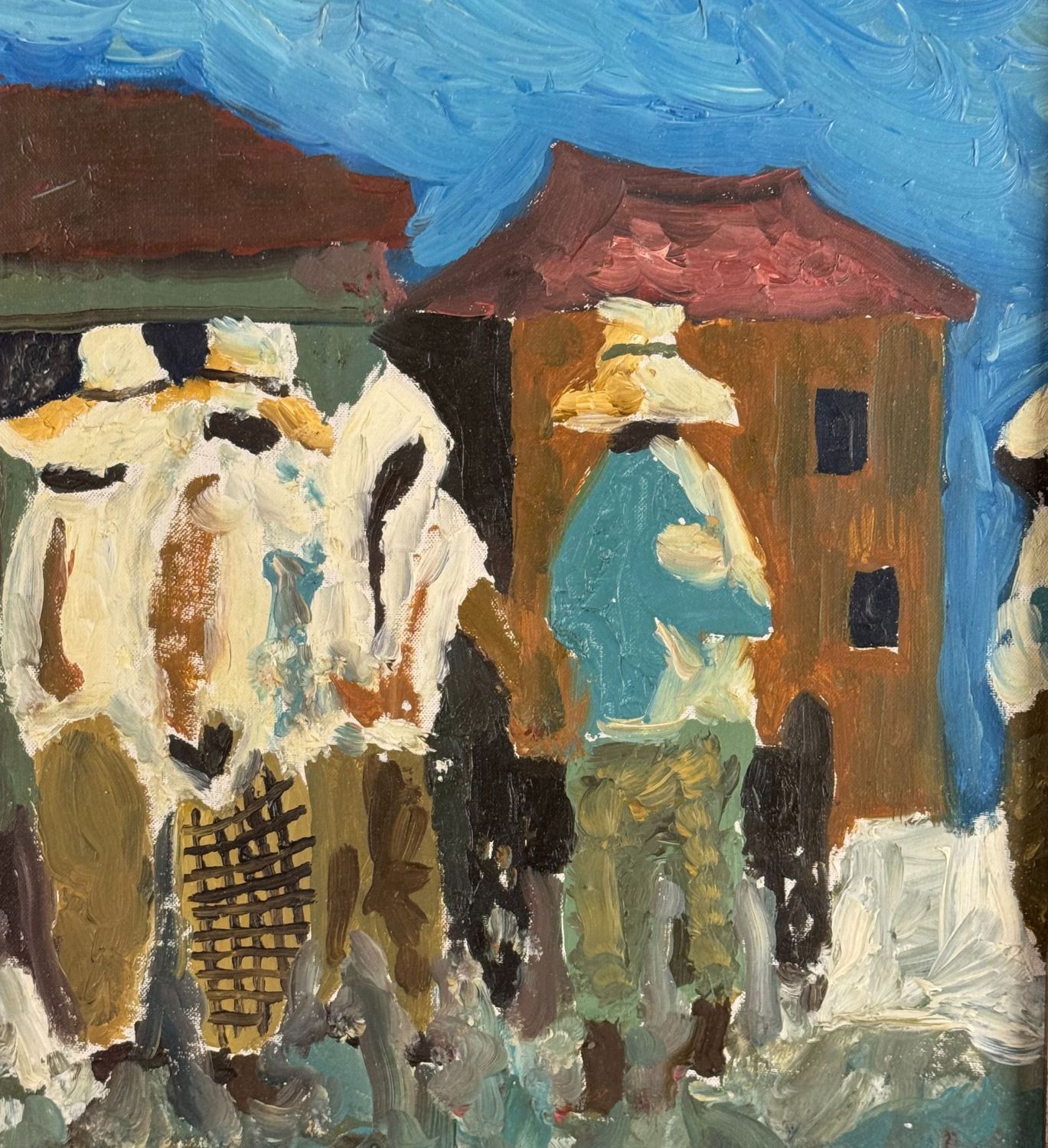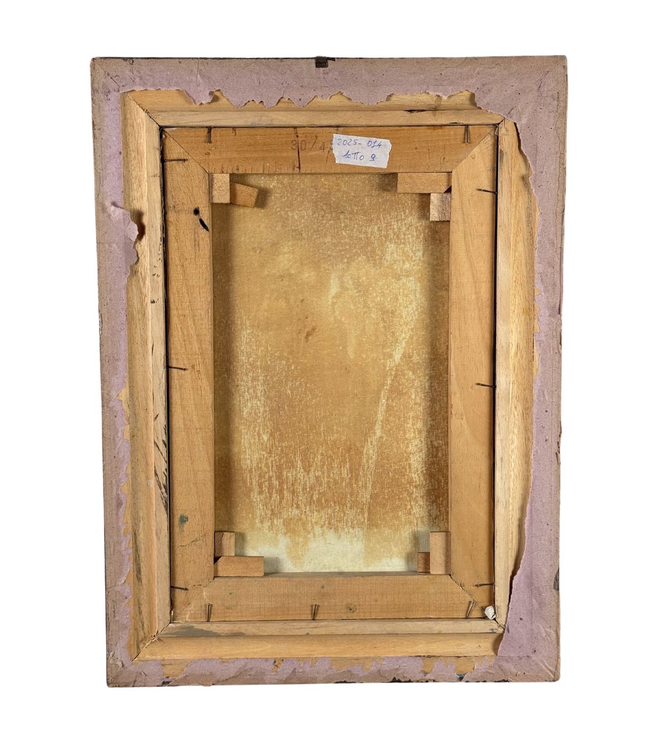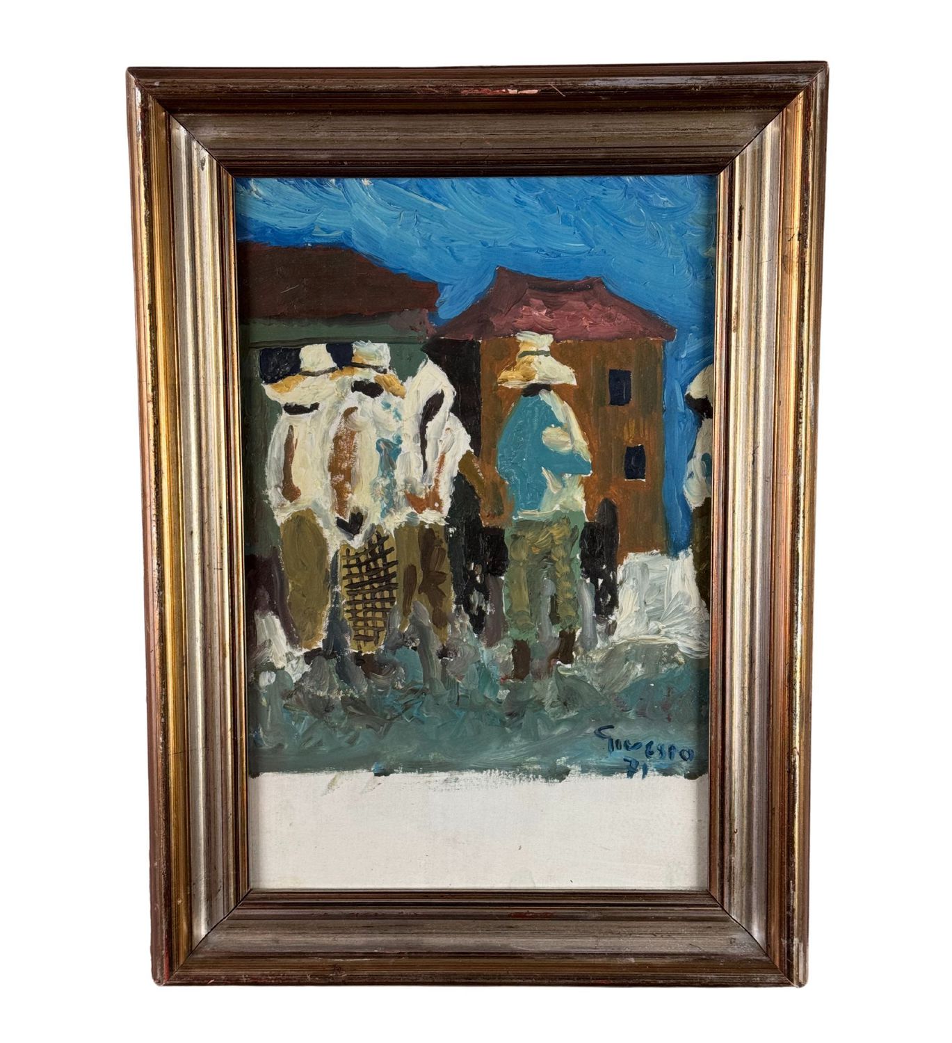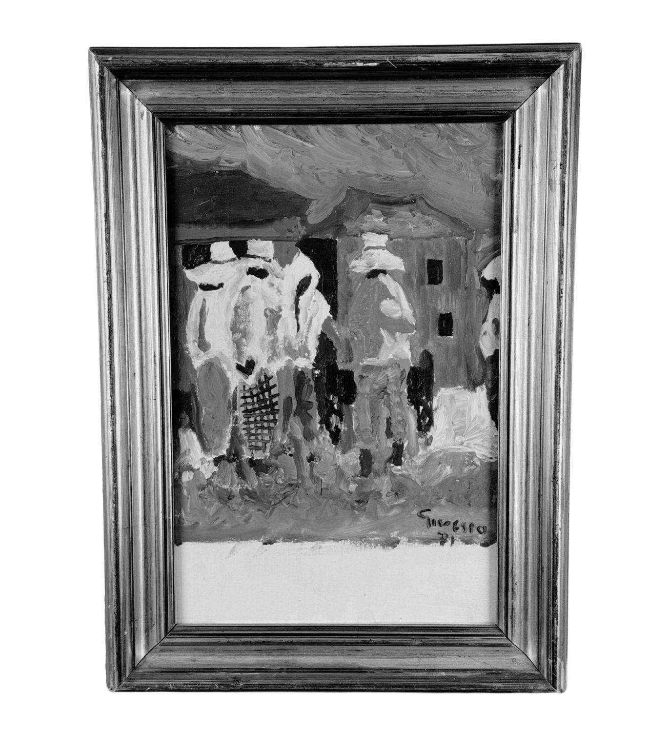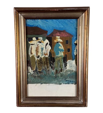 Dipinto olio su tela, periodo XX secolo scuola Italiana, raffigurante Personaggi. Dimensioni compreso cornice: 42x57 cm. Dimensioni interno cornice: 30x45 cm. Reca firma in basso a destra da artista non identificato. Opera in buone condizioni.