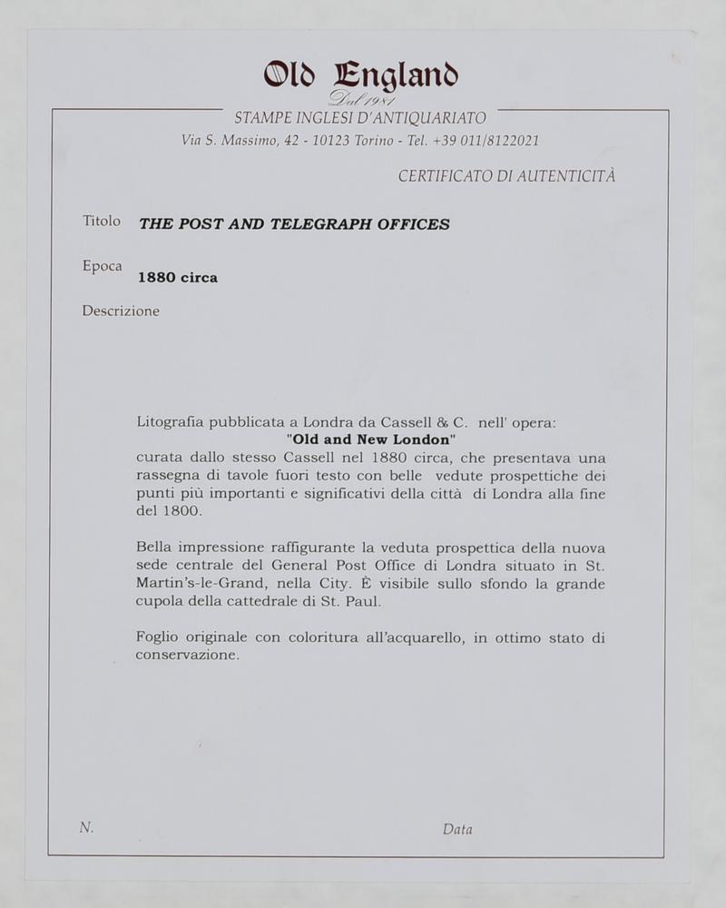 THE POST AND THE TELEGRAPH OFFICES, 1880 circa litografia con acquarellatura...