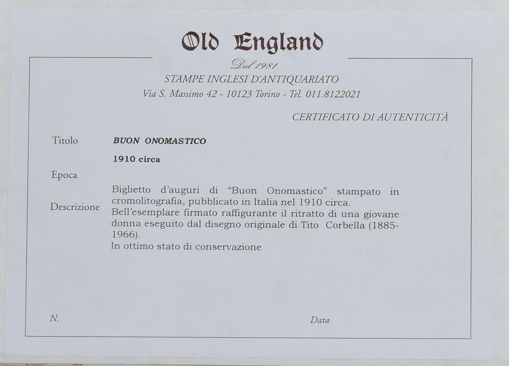 BUON ONOMASTICO, 1910 cromolitografia, cm 15,4x24,4 (con cornice) sul retro:...