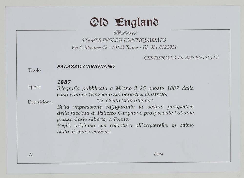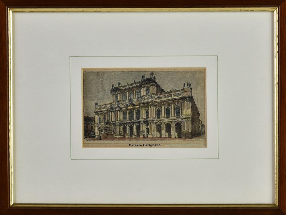 PALAZZO CARIGNANO, 1887 silografia con acquarellatura coeva, cm 22,2x29,1...