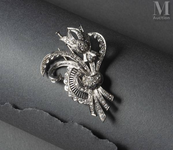 Broche clip de revers en platine (850 millièmes) figurant un bouquet stylisé serti de diamants tailles ancienne, 8x8, brillants et baguettes.
