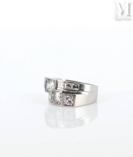 Bague en platine (850 millièmes) formée de deux lignes de diamants ronds taille brillant et baguettes, les deux plus important d'environ 0,5 carat chaque.