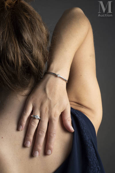 Bracelet jonc ouvrant et articulé en platine (850 millièmes) orné en serti-clos d'un diamant rond taille ancienne d'environ 0,70 carat.