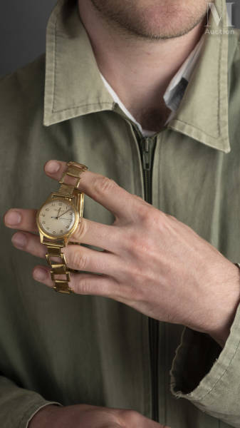 Montre ronde pour homme en or jaune 18k (750 millièmes). Cadran crème avec index chiffres arabes, seconde centrale en acier bleui, verre plexi. Mouvement mécanique à remontage manuel. Boîtier en or 18k avec fond clippé, numéroté 114 819. Diam.: 33mm. Bracelet en or jaune 18k, poinçon de maître Gay Frère, avec des maillons supplémentaires. Boucle ardillon.