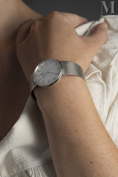 Montre en or blanc 18k (750 millièmes). Cadran fond écorce, index bâtons appliqués, aiguilles émaillées, verre minéral.