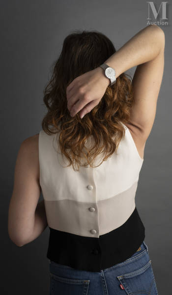 Rapport de condition: Montre fonctionnante en l'état, légères rayures d'usage au dos du boîtier, avec maillons supplémentaires, boîte et facture en date de 1986.