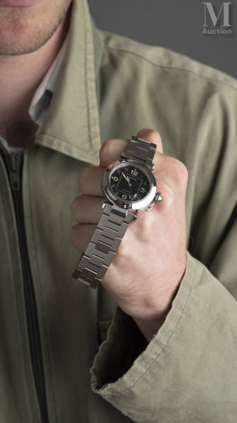 Montre Pasha en acier. Cadran fond noir, index chiffres arabes peint et chemin de fer, aiguilles luminescentes, guichet date cyclope entre 4 et 5h, trotteuse centrale, verre saphir. Mouvement mécanique à remontage automatique. Boîtier acier fond vissé (8 vis) numéroté CC767572. Diam.: 36mm.