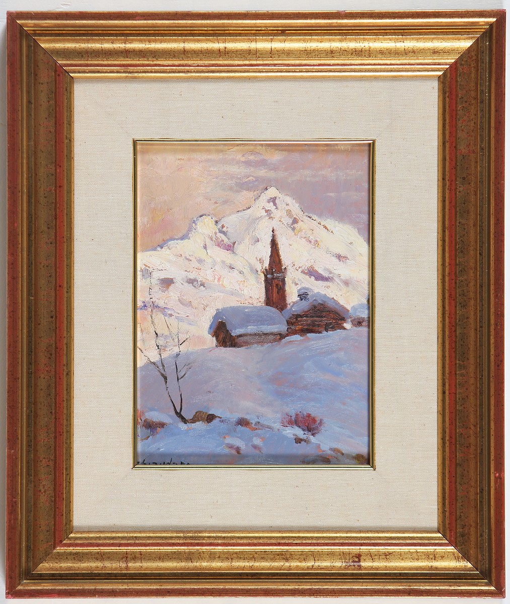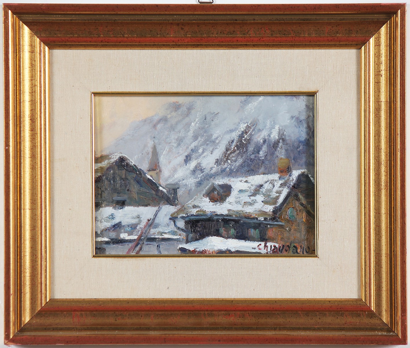 CHIAUDANO BEPPE (n. 1936) Coppia di dipinti. Scorcio ad Entredes, Chiesetta di montagna. Olio su cartone. Cm 24,00 x 18,00. Firmati in basso a destra e in basso a sinistra. Cornice presente