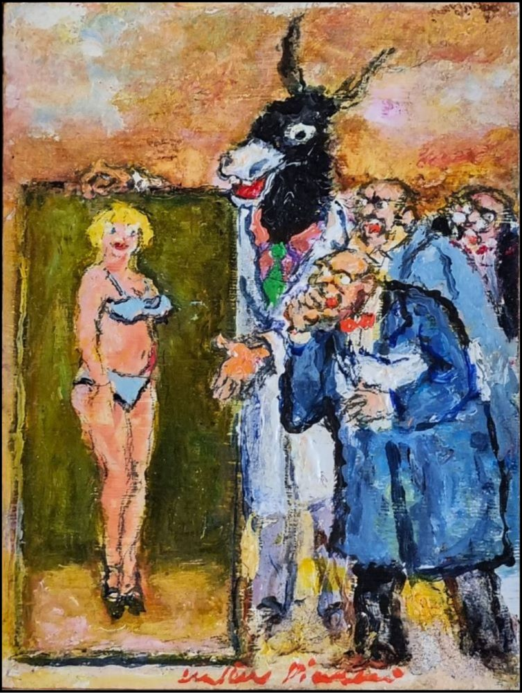 PIACESI WALTER Ascoli Piceno 1929 - Fermignano 2022 "Genio e supervisori" Olio su tavola cm 18x24 del 2012. Firmato sul fronte in basso al centro. Al verso firma, titolo, tecnica e numero d'archivio. Autentica firmata dal Maestro con numero d'archivio a cura di Studio d'Arte Ca' Spinello.