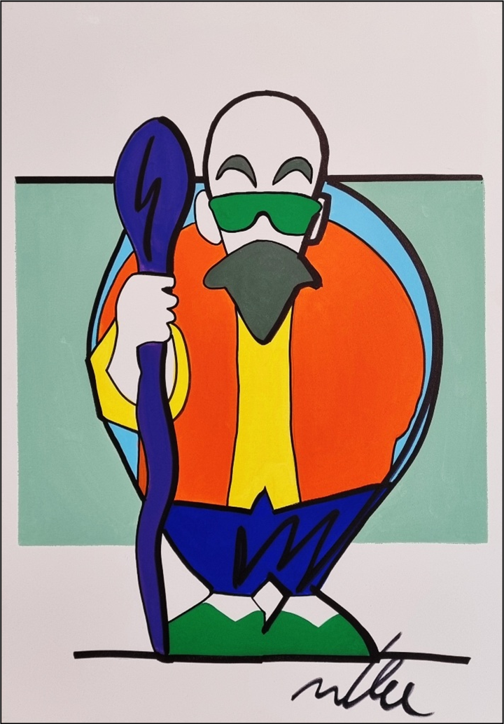 LODOLA MARCO Dorno 1955 "Maestro Muten" Acrilici e smalti su tela cm 70x100 del 2014. Firmato sul fronte in basso a destra e al verso. Autentica ed archivio su foto a cura dell'Archivio Generale Marco Lodola.