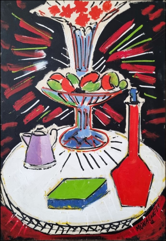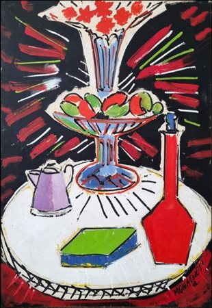MONACHESI SANTE Macerata 1910 - Roma 1991 "Natura morta" Acrilico su tela cm 70x100 del 1976. Firmato sul fronte in basso a destra. Autentica ed archivio su foto a cura di Donatella e Luce Monachesi.