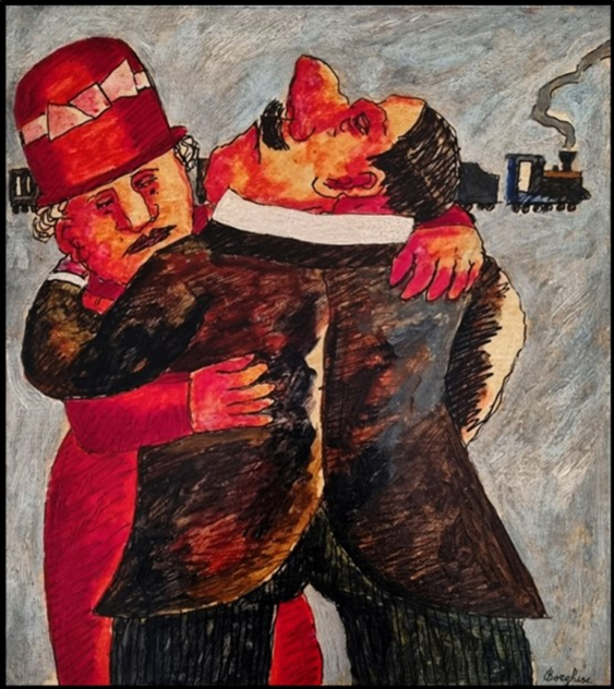 BORGHESE FRANZ Roma 1941 - 2005 "L'abbraccio" Olio su tavola cm 40x45. Firmato sul fronte in basso a destra. Al verso firma ed etichetta descrittiva. Autentica su foto a cura del Maestro con timbro a secco.