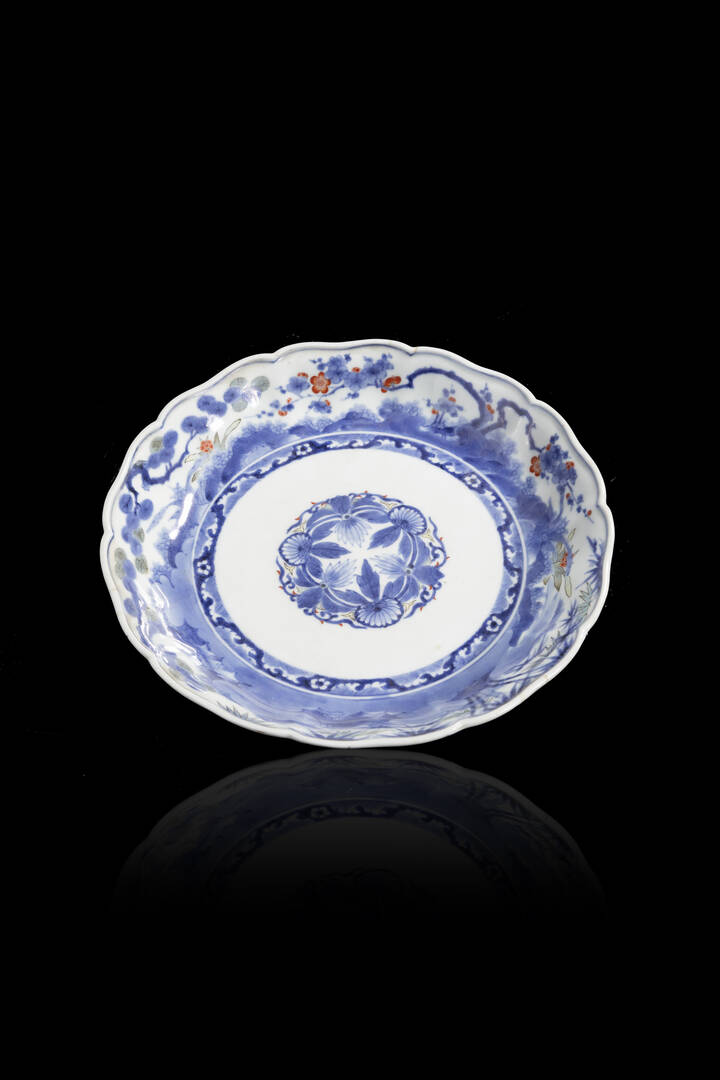 Piatto in porcellana bianco e blu decorato con motivi floreali, Cina, dinastia Qing XVIII Sec.