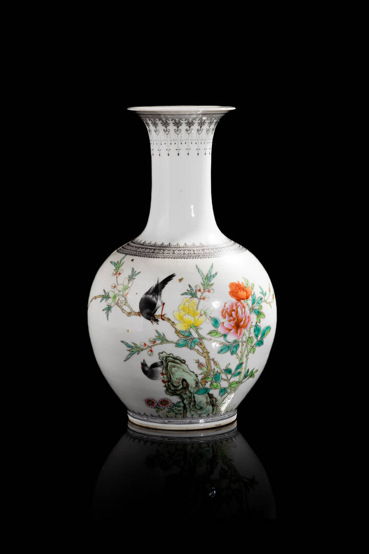 Vaso in porcellana decorato con peonie, uccelli e iscrizioni, Cina, Repubblica XX Sec.
