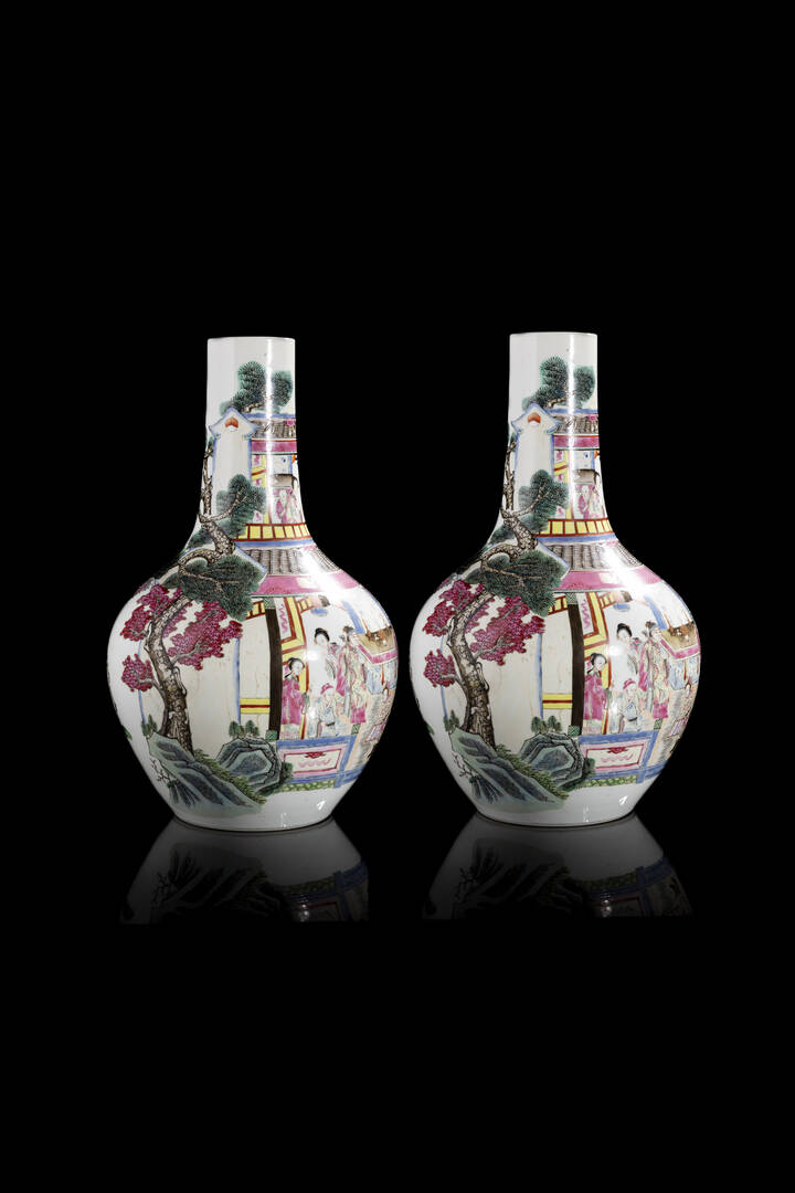 Coppia di vasi in porcellana Famiglia Rosa dipinti con scene di corte
