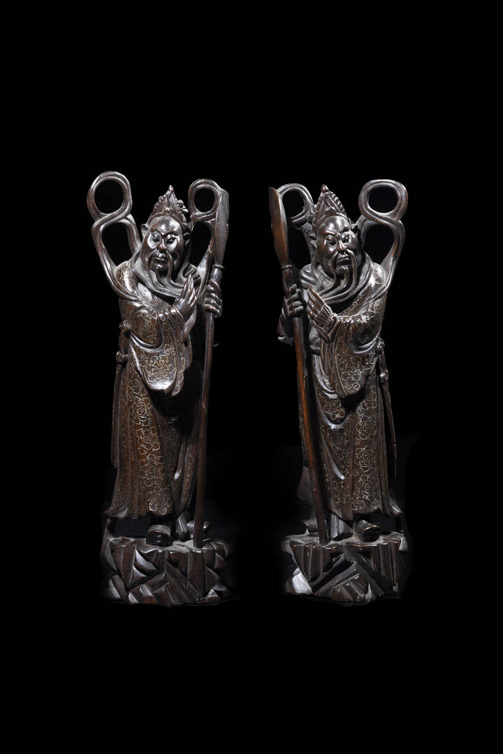 Coppia di dignitari in legno con intarsi in filo d'argento, Cina Repubblica XX Sec.