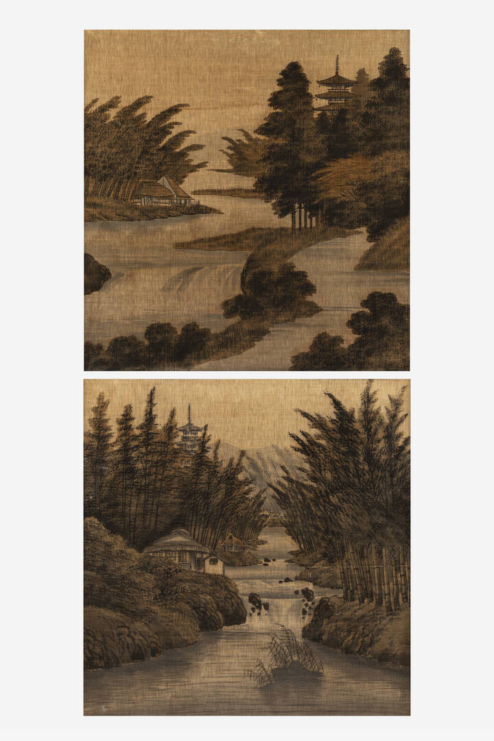 Lotto di due quadri orientali decorati con paesaggi fluviali, Cina, Repubblica XX Sec.