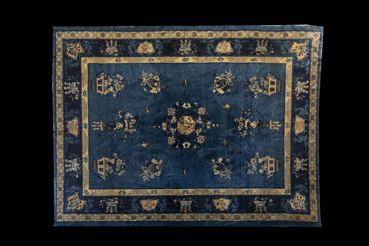 Tappeto Pechino su fondo blu con decori vegetali, Cina, Repubblica XX Sec.