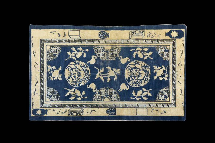 Tappeto Pechino decorato a motivi vegetali a fondo blu e beige, Cina, Repubblica XX Sec.
