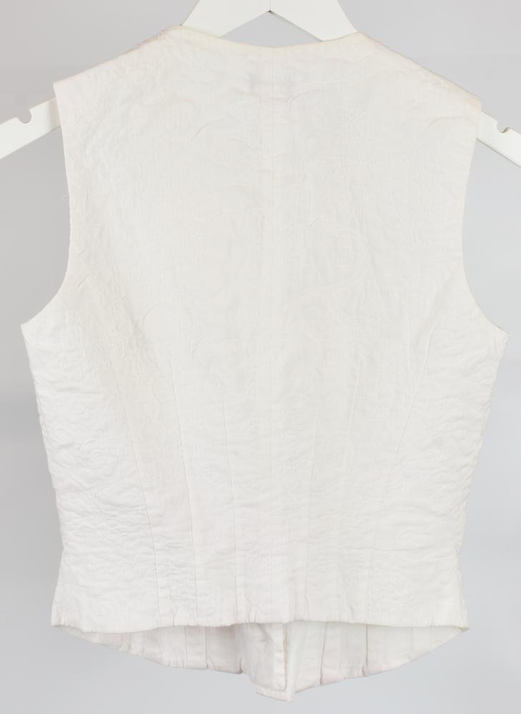 Top smanicato bianco ricamato tono su tono. Taglia 36. Prodotto in Francia. Presenta aloni e qualche segno d’uso. Ben conservato.